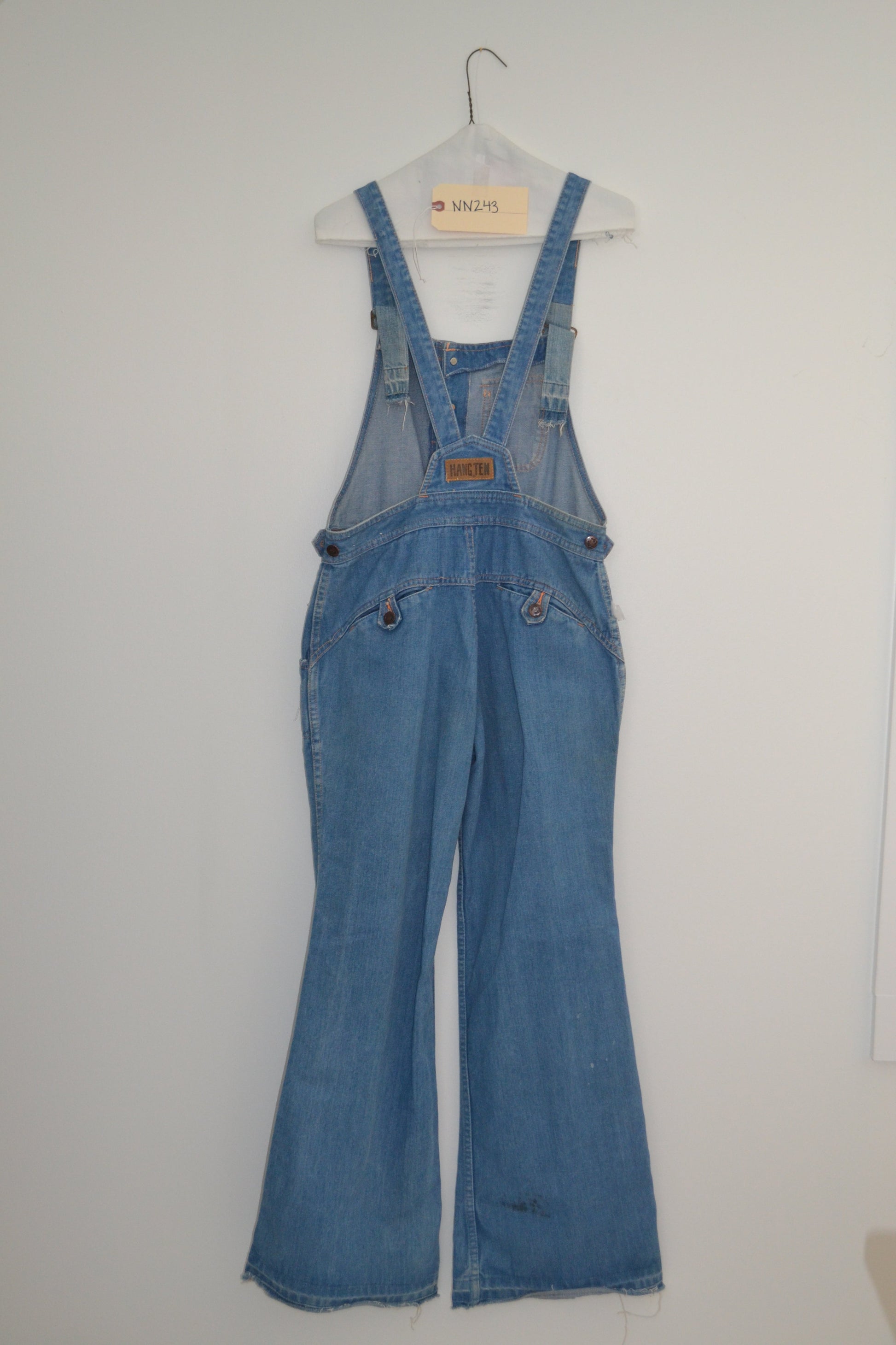 1970's Hang Ten Fashion Overalls. This adorable light blue denim Hang Ten Flare Overalls has a button through bib and great back pocket details.