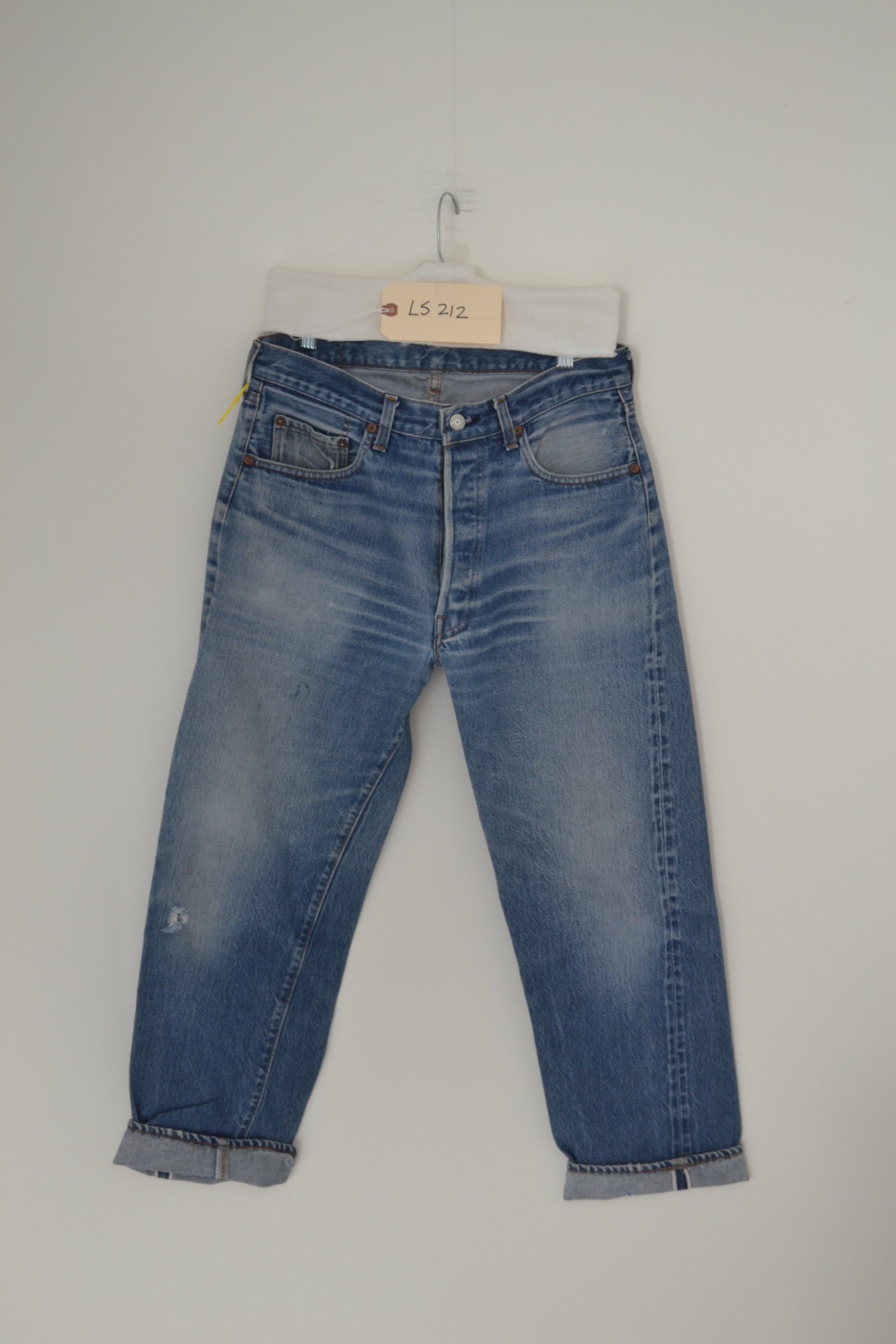 1970's Vintage Selvage 501 Jean. This medium wash jean has great vintage charm. The intense whiskers, heavily faded thigh and knee and tiny hole, The back has great back pocket wash details including harmonica and wallet impressions.