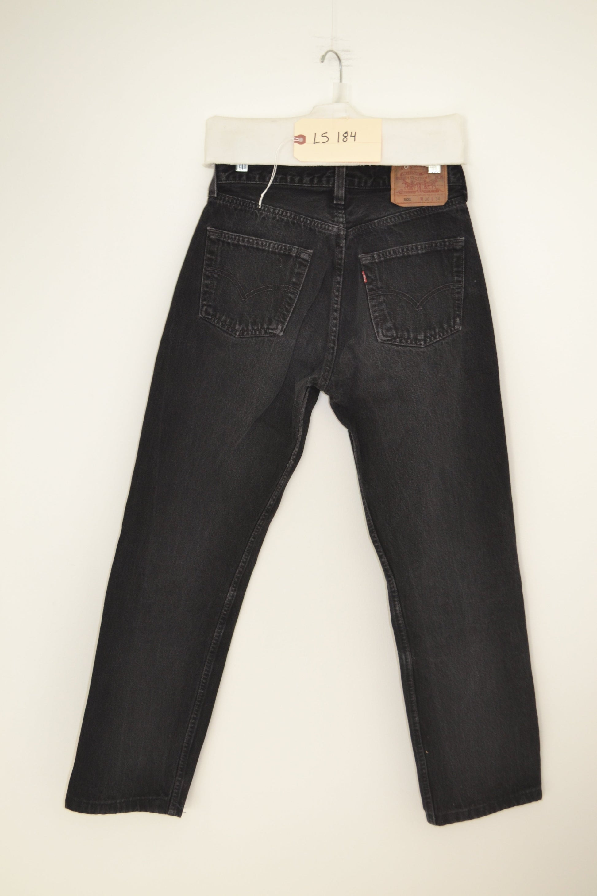 1970's Levi's Little E 501 Jean. This Black/ Black denim has a subtle marble effect and has wear details including high point abrasion and highs and lows of color.