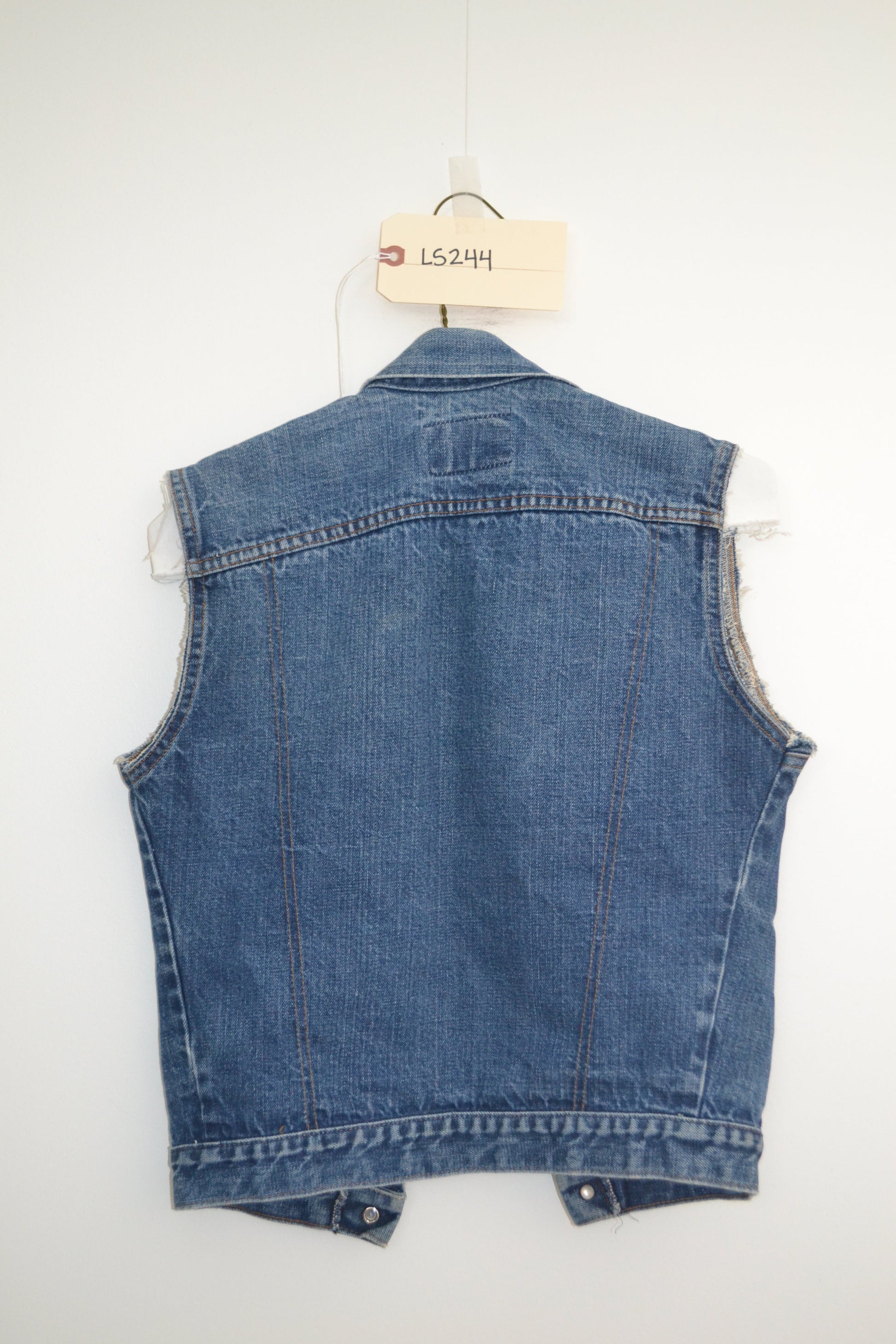 1970's Vintage Levi's Orange Tab Denim Vest . This jacket has been customized, with the sleeves cut off to become a vest. It is a medium blue shade and has style details including faux front and back panels and a snap front closure.