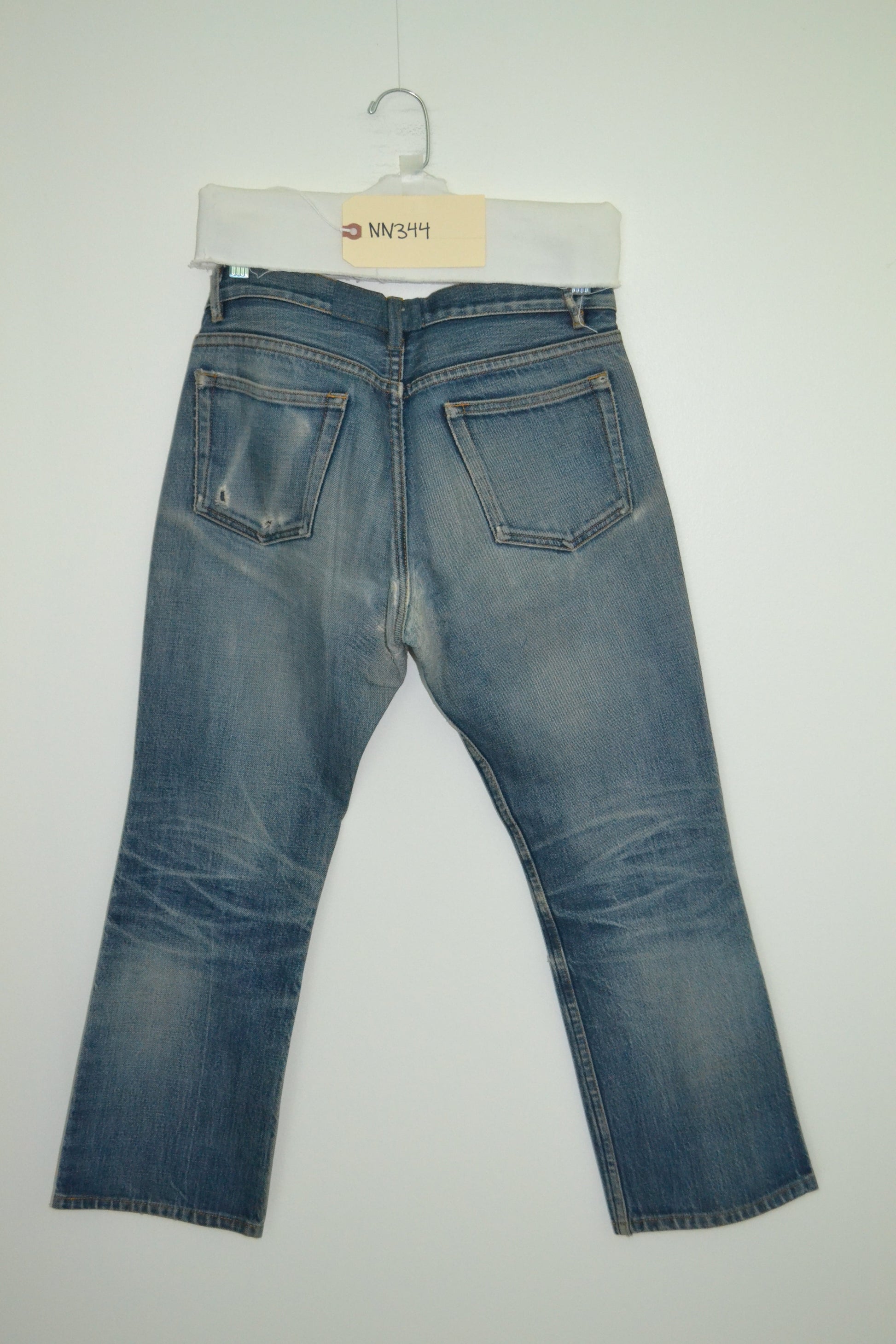 1990's A.P.C. Medium shade Jean. I personally wore this in from rigid! There are amazing whiskers and high low contrast. Great back knee webbing and repairs. The cast and patina is sublime!
