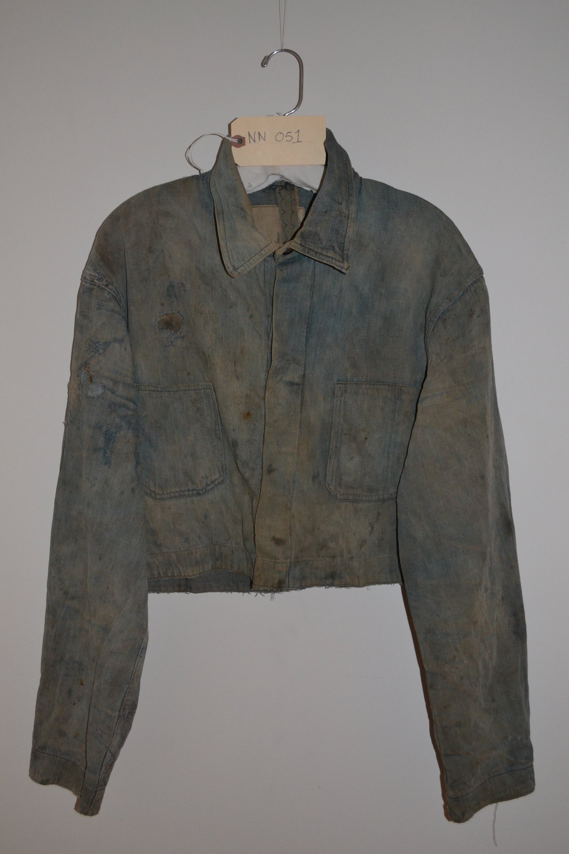 1920's Cut off Workwear all in one top. This is the top half of a workwear All in one that is super faded and shows years of wear, repair, dirty stains, arm wrinkles and frayed distressing on waistband edge.