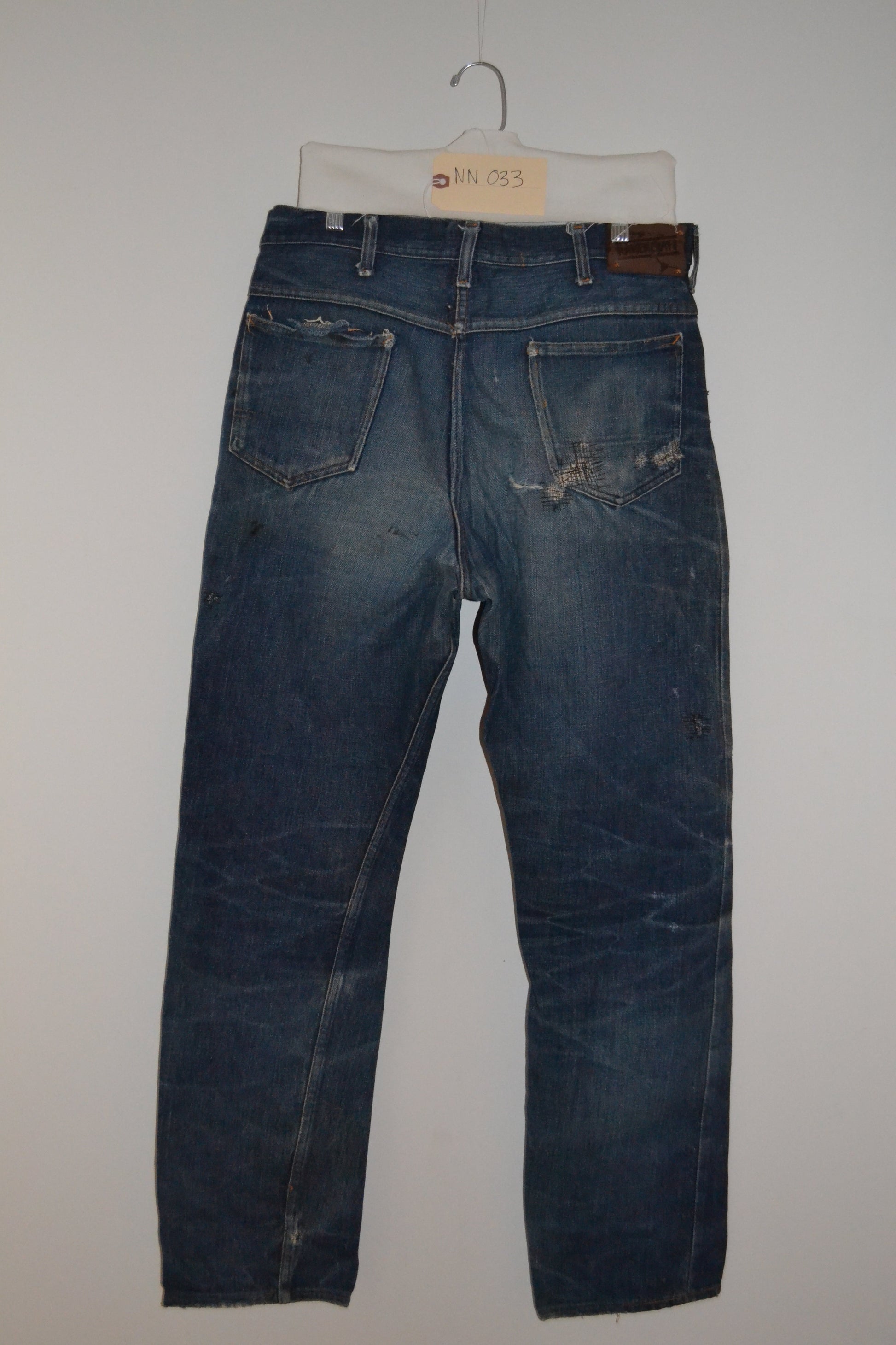1920's JCPJ Ranchcraft Jean. This amazing dark blue shade button fly jean has great wear details, holes, and destruction.The custom patching and repair has hand stitched zig zag and cross stitched reinforcement.