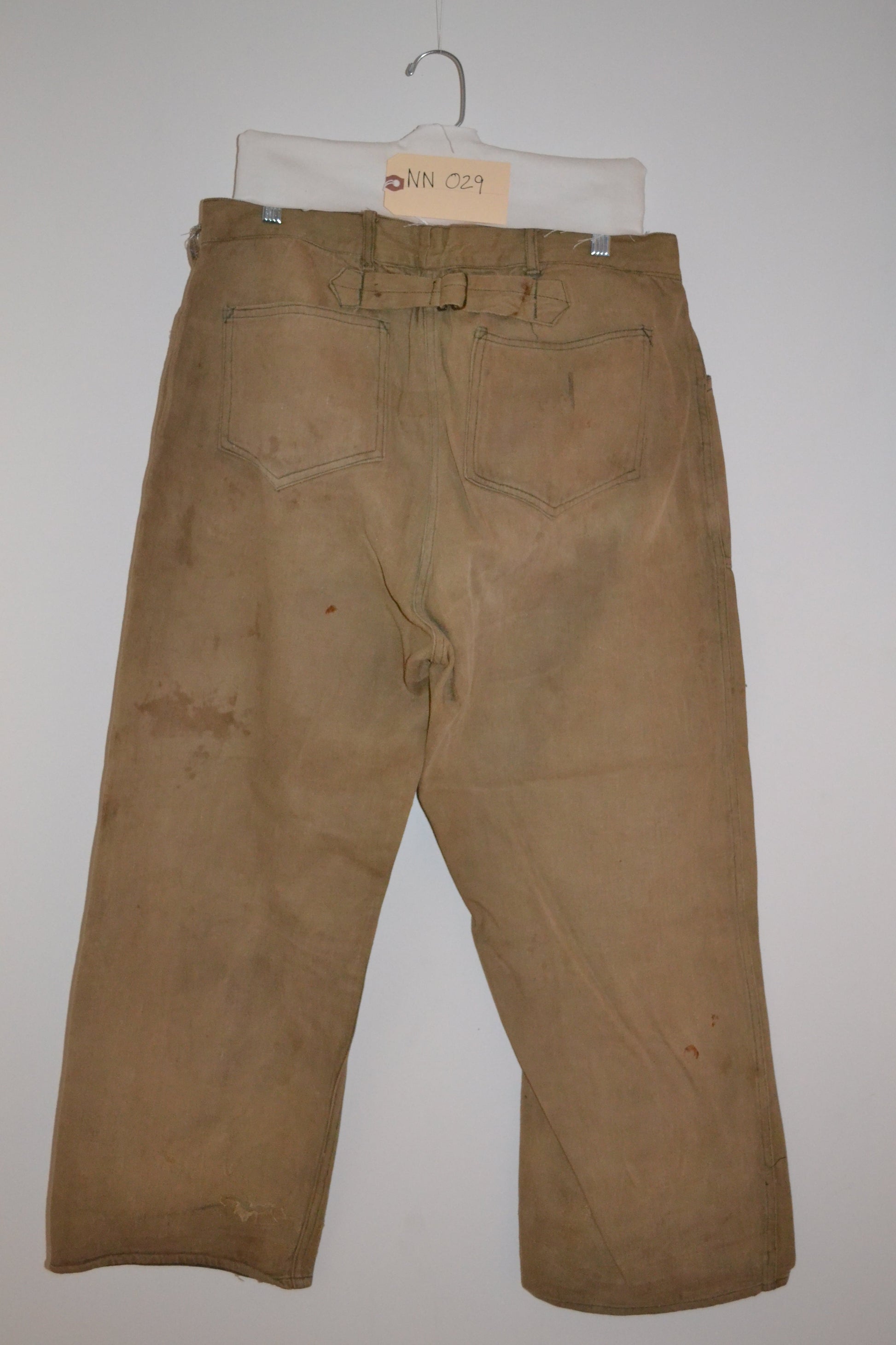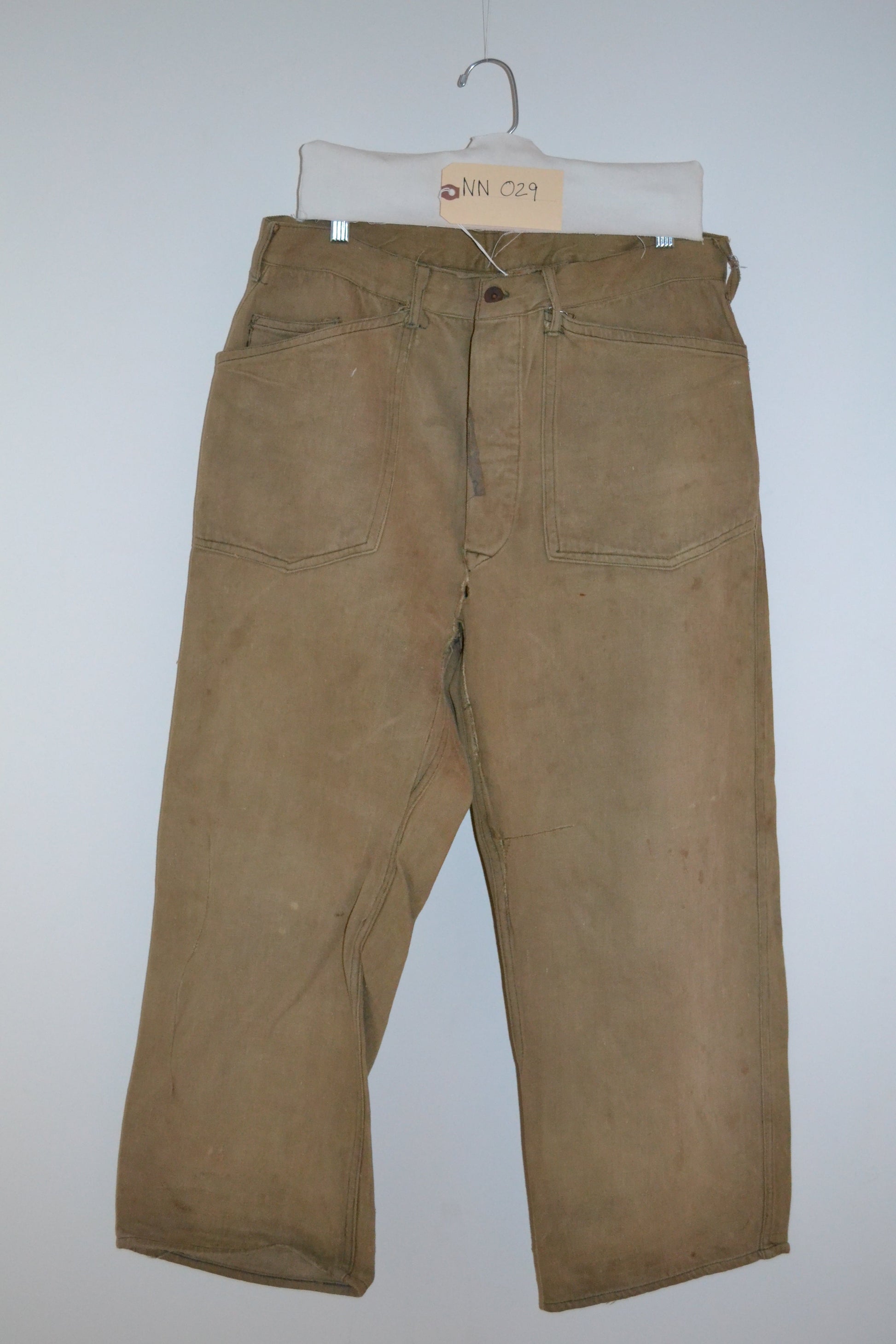 1920's Khaki Yarn Dye Workwear Jean. This worker pant has double felled buckle back, button fly, great wear, fade and vintage details.