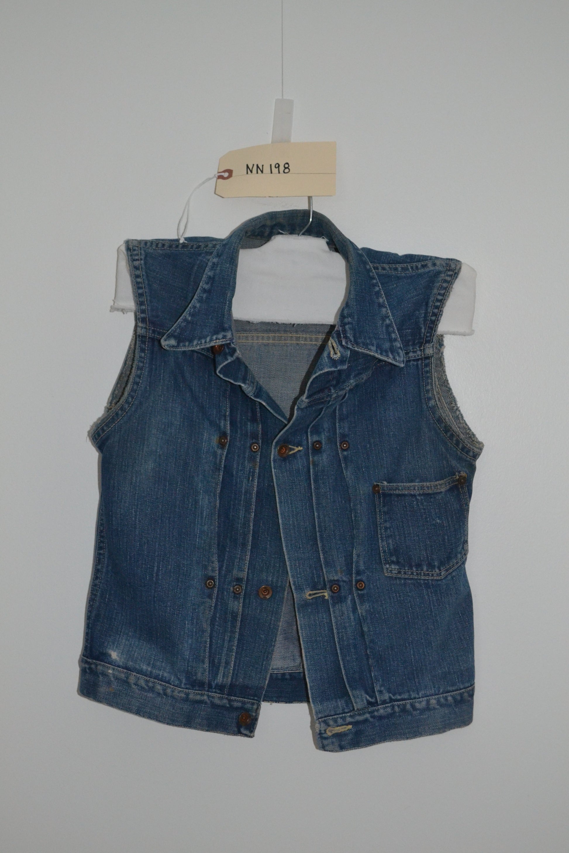 1930's Denim Vest. This medium dark indigo vest has front pleats with metal rivets, a single chest pocket, and back pleats.