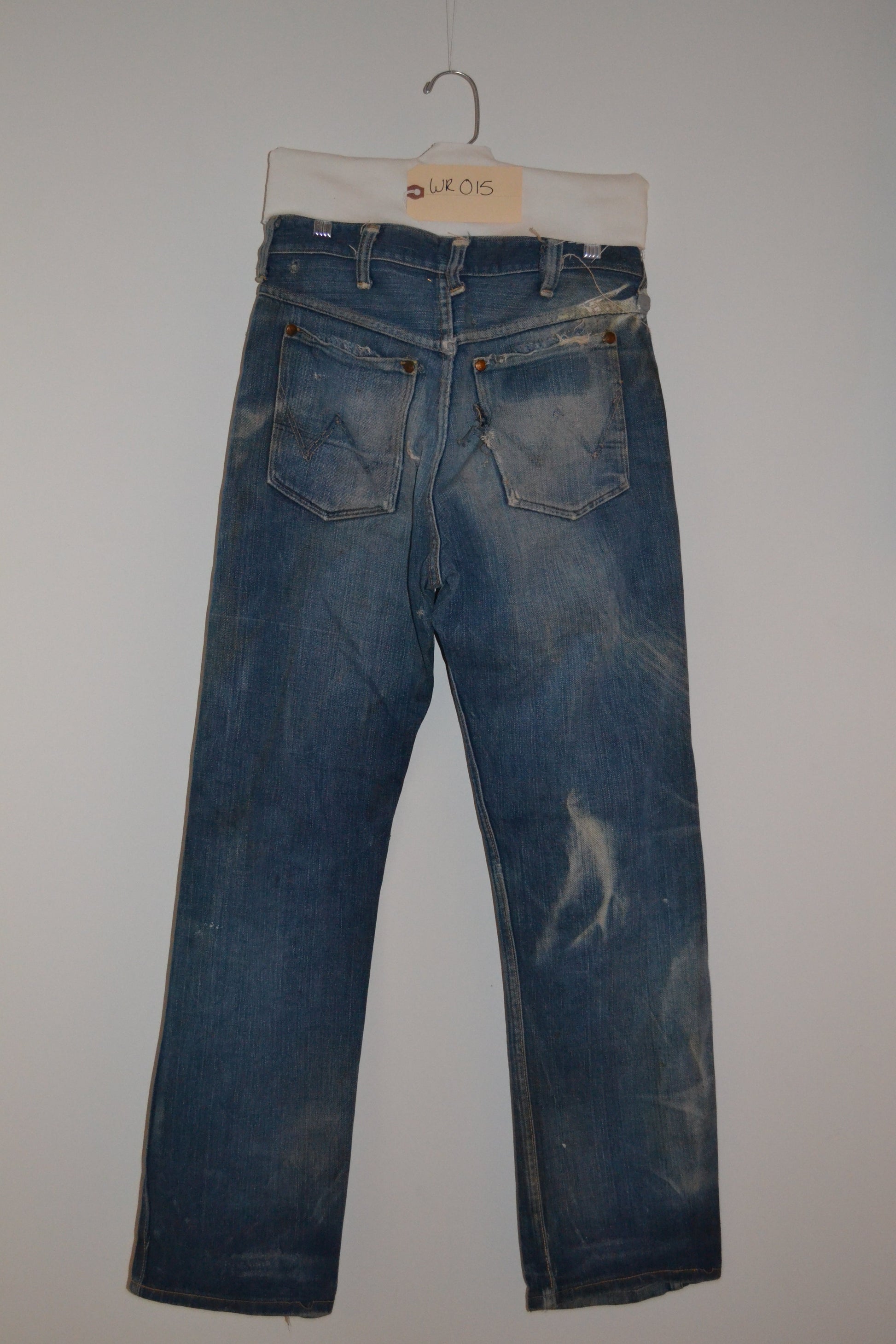 1940's Wrangler Jean. This is medium blue wash denim with button fly, double felled seams, bleach stains, repair, patches. and distressed seams.