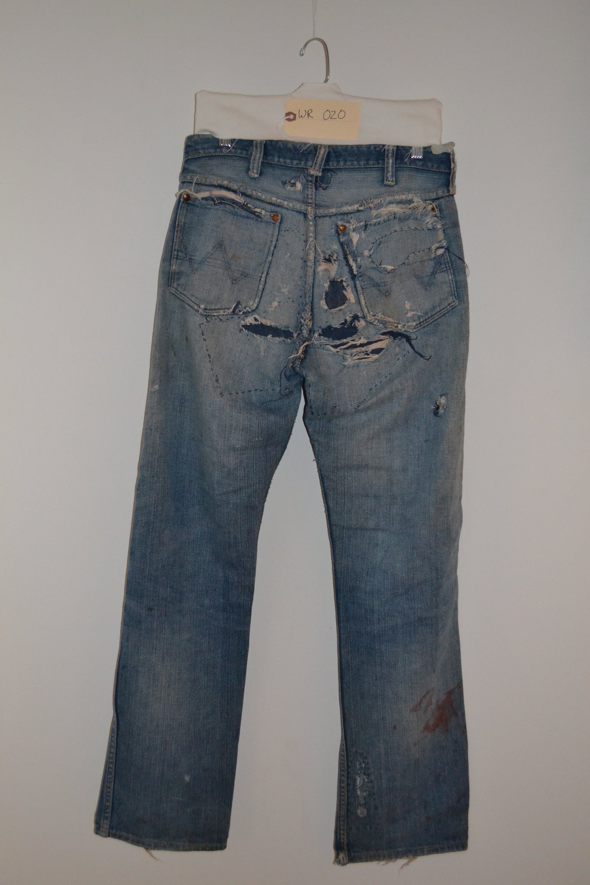 1940's Wrangler Jean. This is a medium light blue wash denim with a zip fly and double felled seams. IT has amazing customization, contrast denim patching and repair, destruction ,distressing, and color staining throughout.
