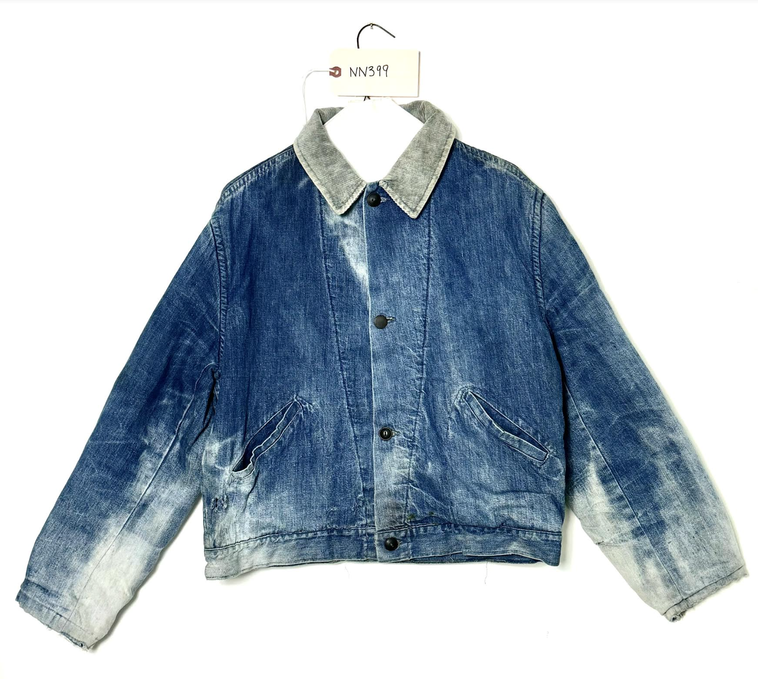 This 1950s Chore Jacket has fantastic wear. The lightweight 2x1 has great warp striations and slubs. It has a pastel vertical striped blanket lining and a corduroy collar. There is great sunbleaching all over the garment. I love the angled design of the front placket.