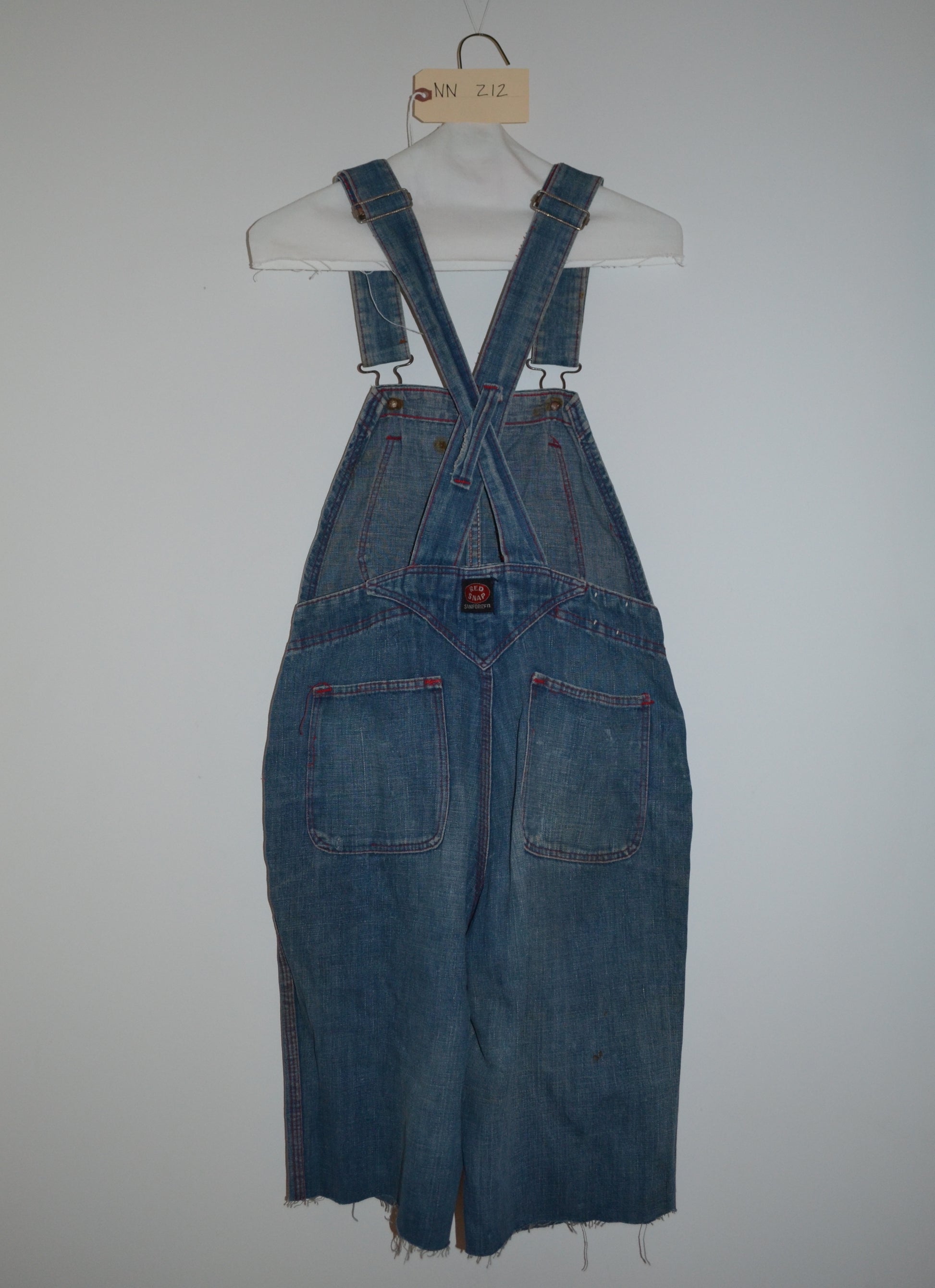 1950's Denim Shortall. This fashion workwear super small shortall is a medium washed denim with great wear. It has red etched metal snaps, a button fly, back overall straps that attach to the waist.