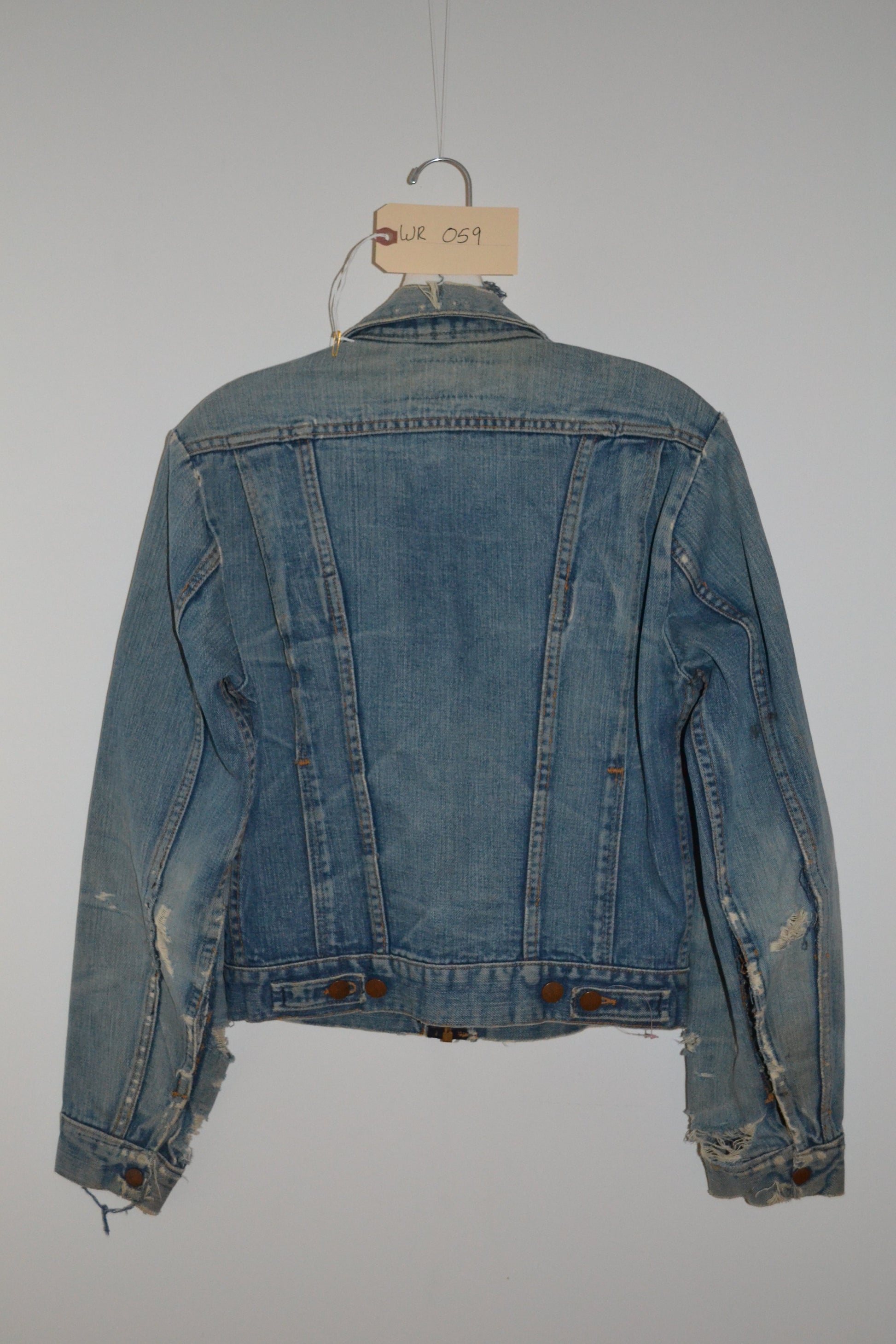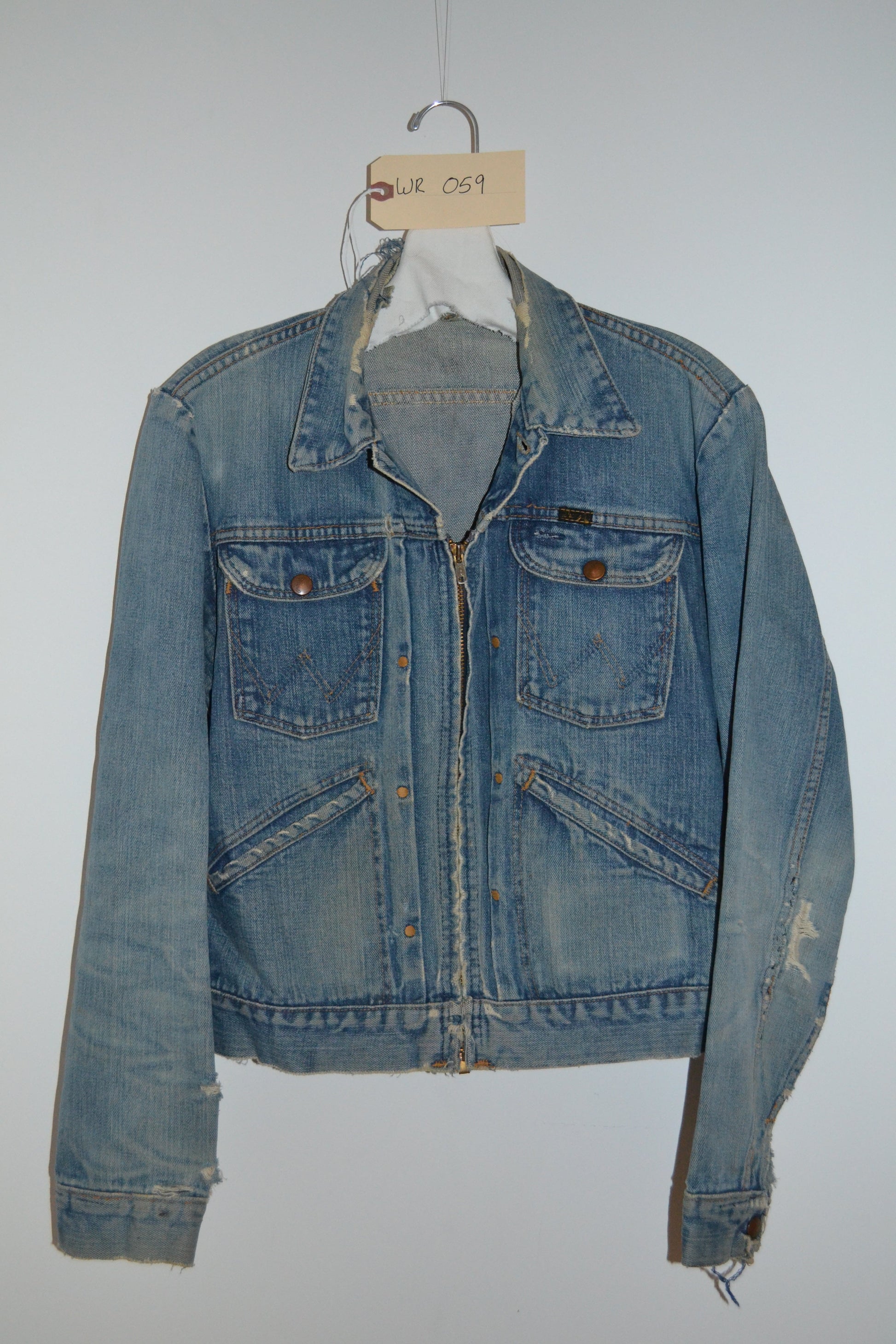 1950's Wrangler Jacket . This medium light faded Left Hand twill denim jacket has great wear and vintage detail. It has selvage, zip front, single pleats with round bartacks and the distressed wash includes amazing seam abrasion,back creases arm wear and destruction and holes,
