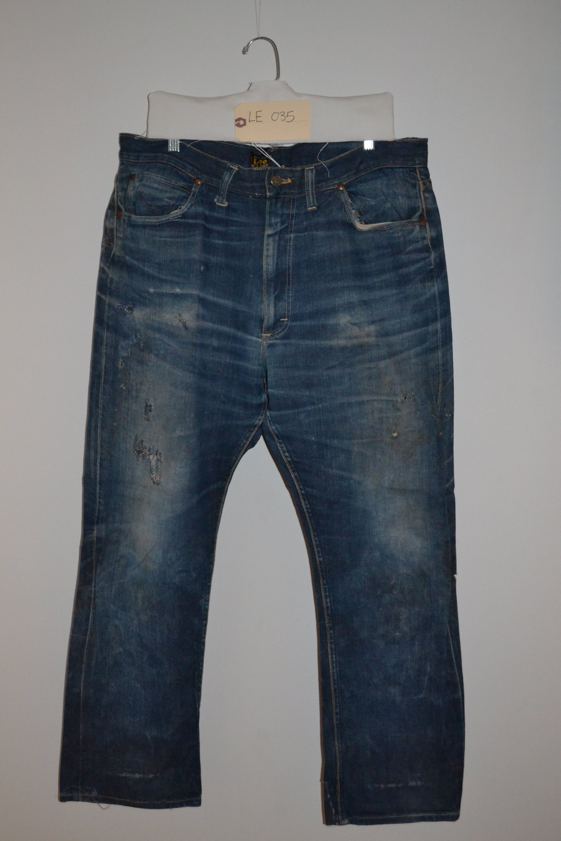 1960's Vintage Lee Green Cast Left Hand Jean. This Jean has great wear patterns, whiskers, repair stitch and sunfade. on a dark ground shade.