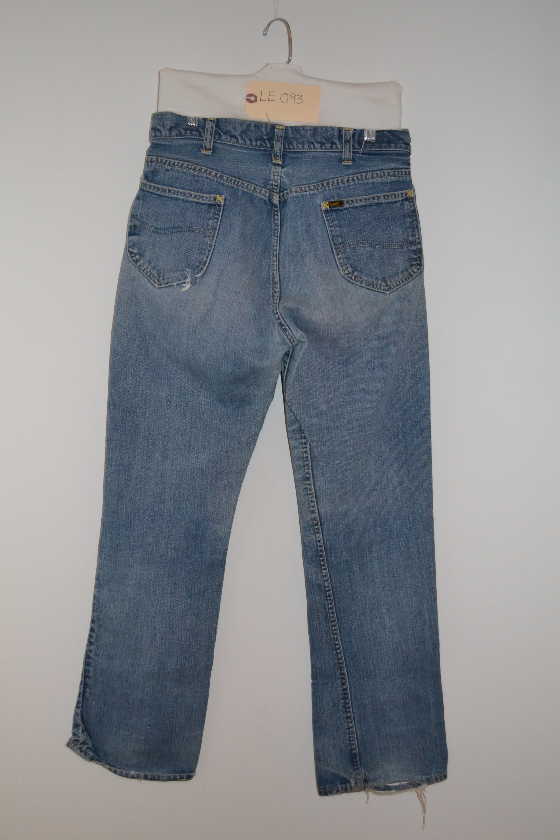 1960's vintage Lee Left Hand Jean. This jean has a unique blue green cast in a light shade. This jean has great whiskers, waistband and front facing crunches and extreme busted side seam high low.