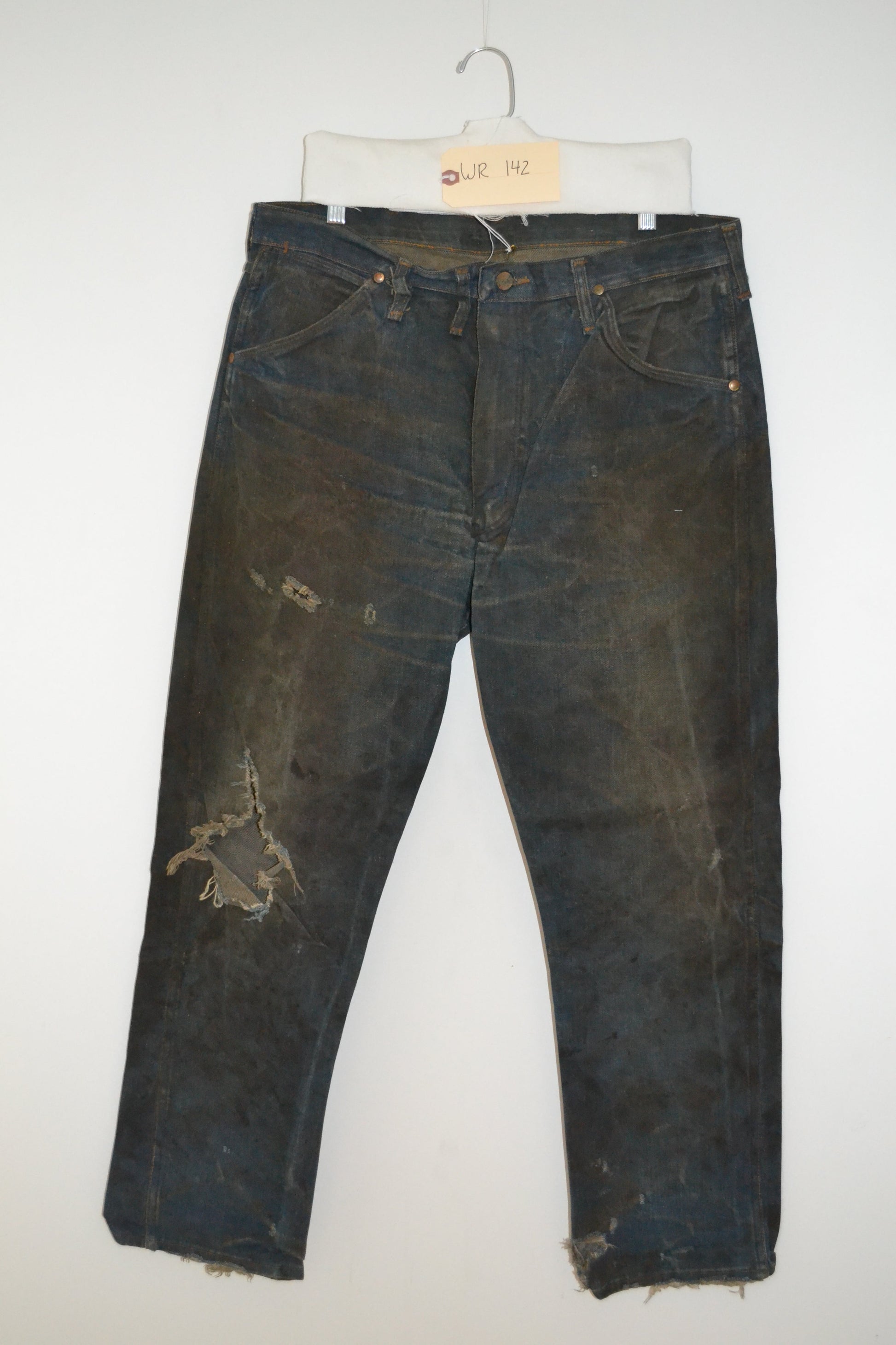 1960's Wrangler Jean. This zip fly jean is a denim collector's dream. IT has such great wear, grease, destruction, holes and patina look.