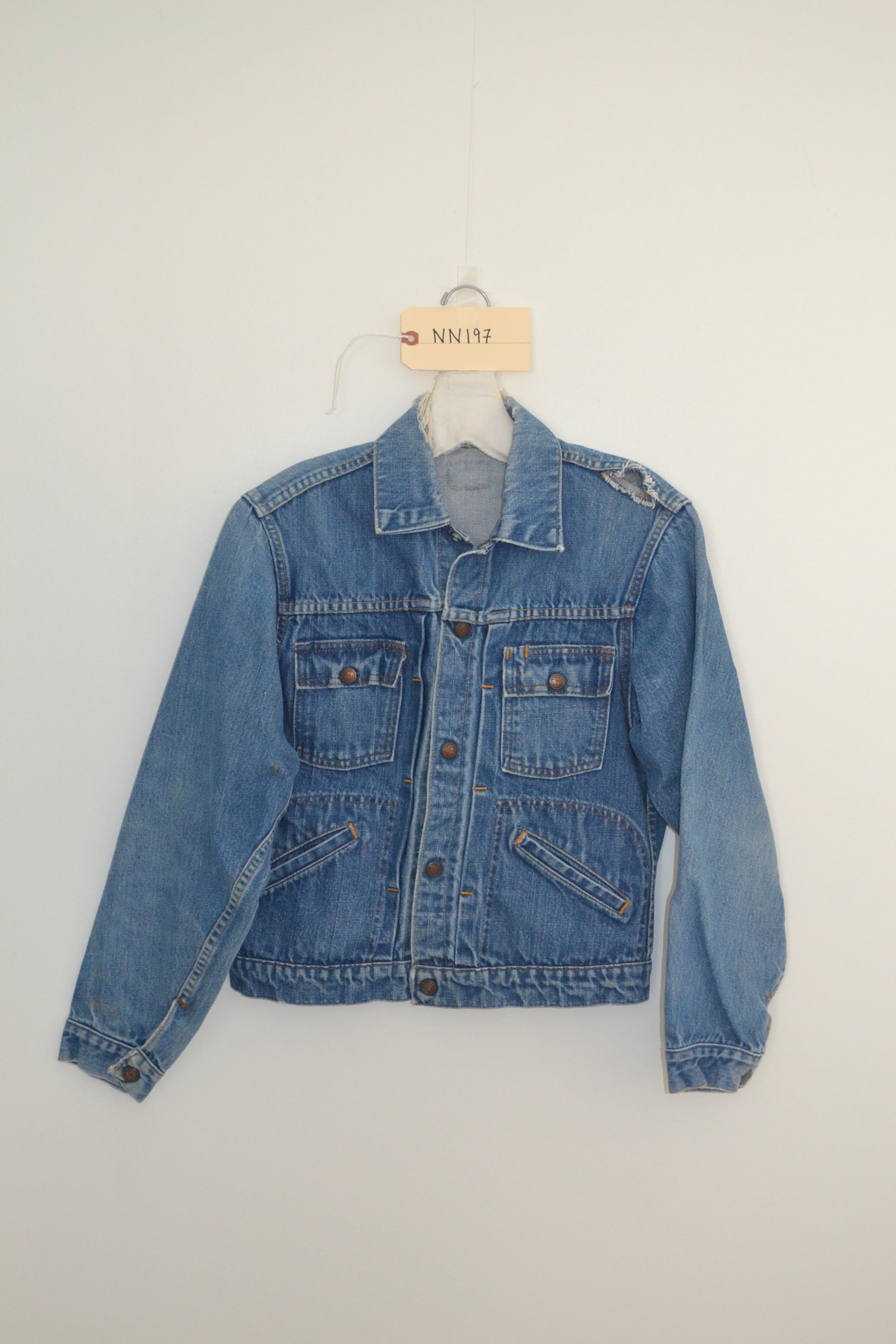 1970's Denim Jacket. This mid blue jacket has snap closure, pleats, and 4 pockets. The wear includes abrasion,, highs and lows and shoulder destruction.