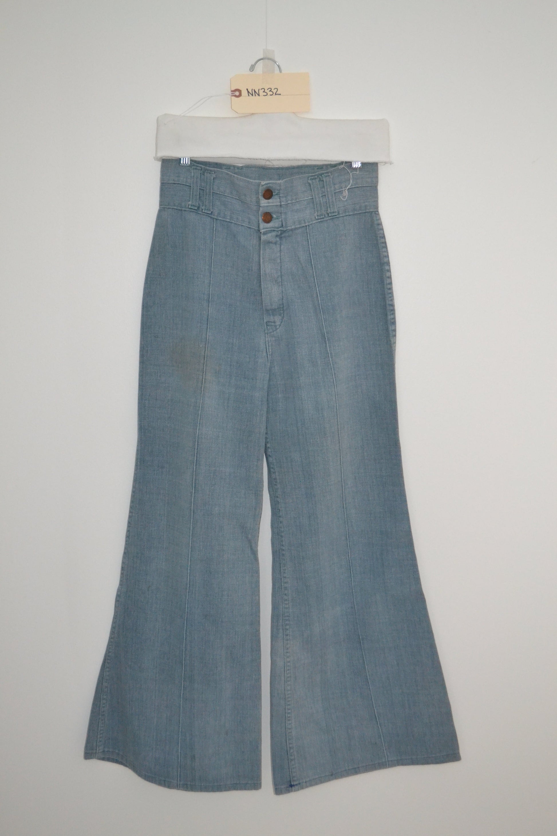 1970's Fashion Jean. This light blue Left Hand Twill denim Flare has great details including a double waistband and pintuck front.