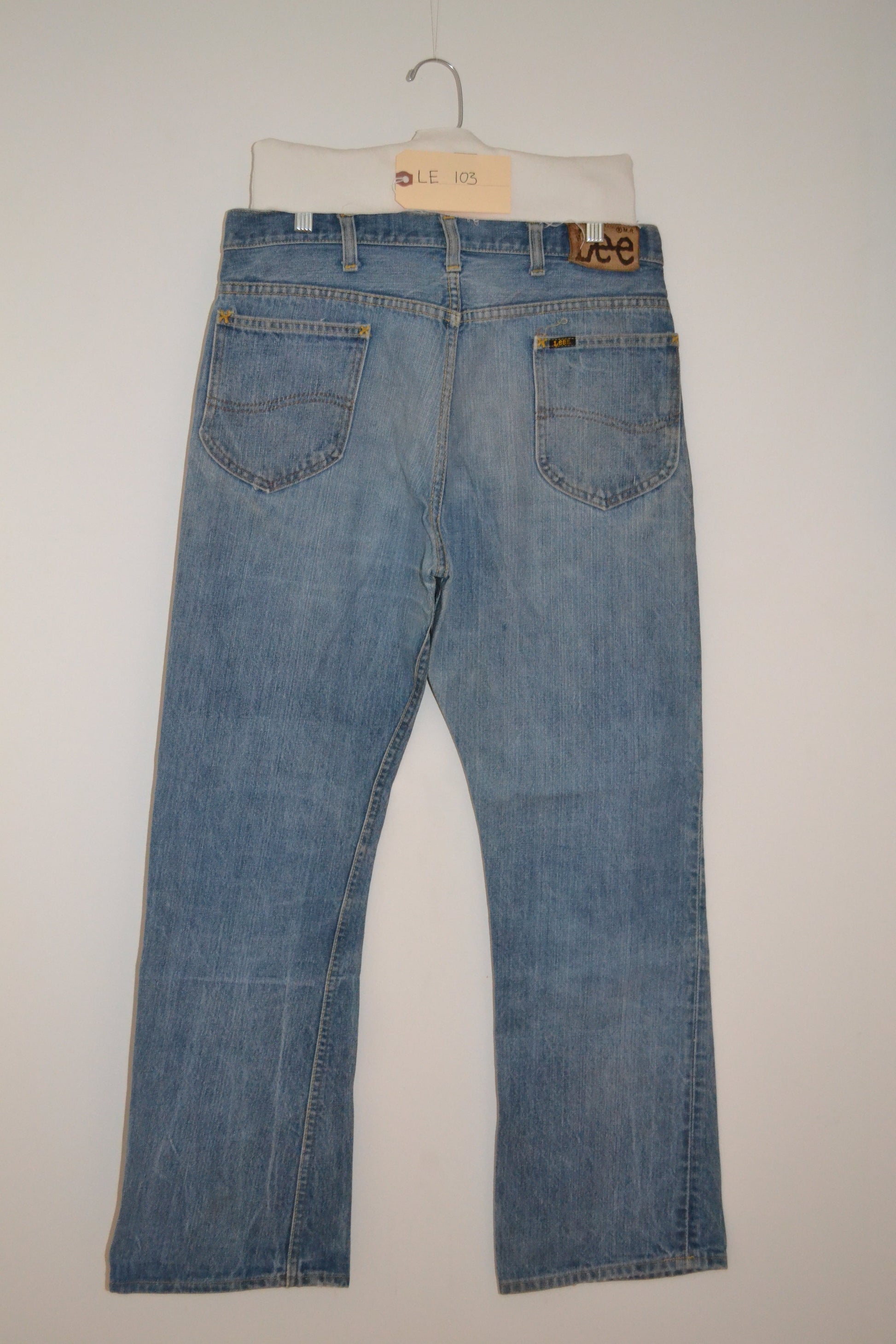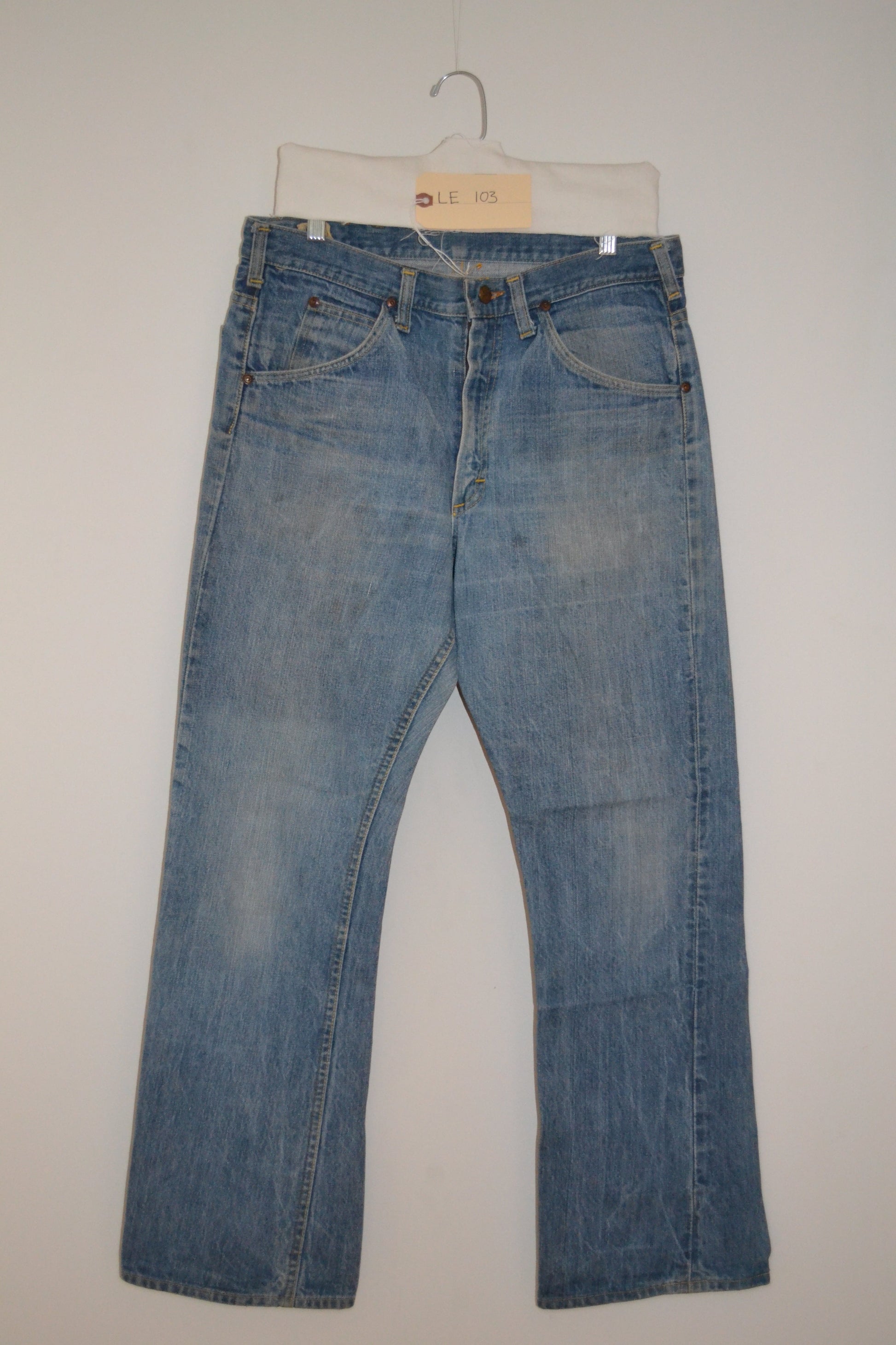 1970's vintage Lee Jean with faded leather patch. This jean is made with streaky, high ridge right hand denim. the jean has really great whiskers, streaks and cracks and great high low on seams.