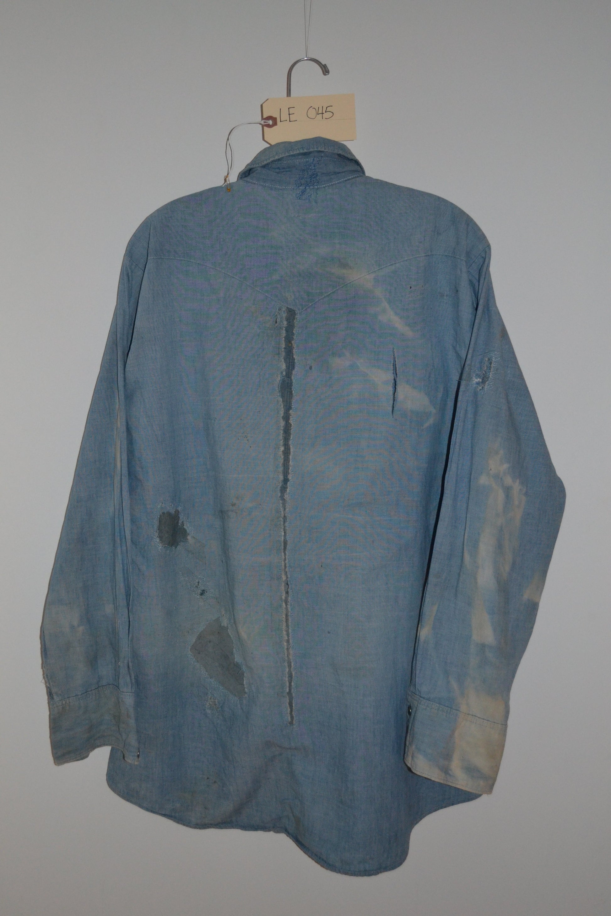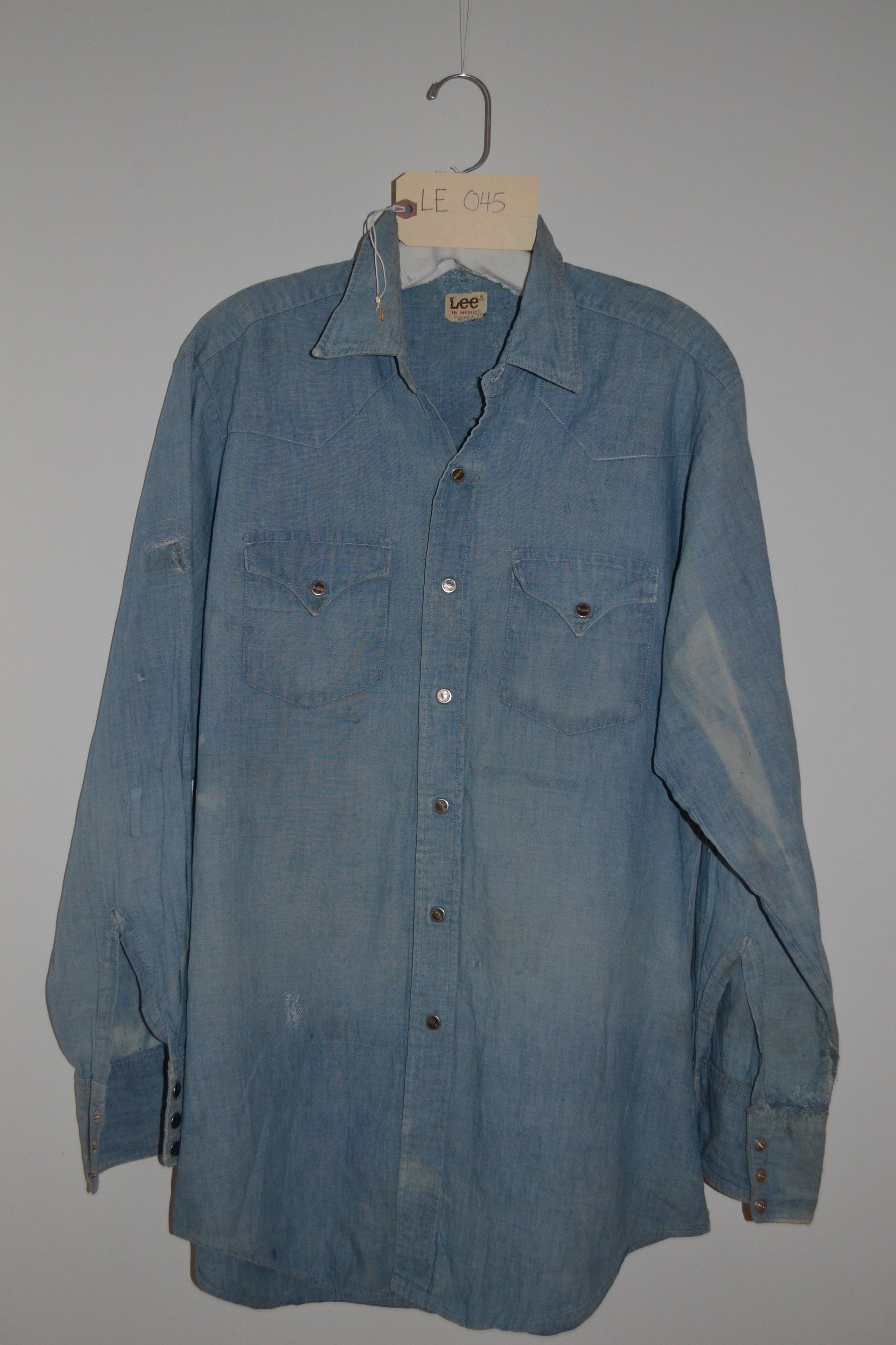 1970's Vintage Lee Chambray Shirt. This snap fromt western shirt has exterme pointed pocket flaps and deep cuffs. The wash, wear and repair on this shirt is amazing with sunbleach spots, patch and repair and great sunfade medium shade.