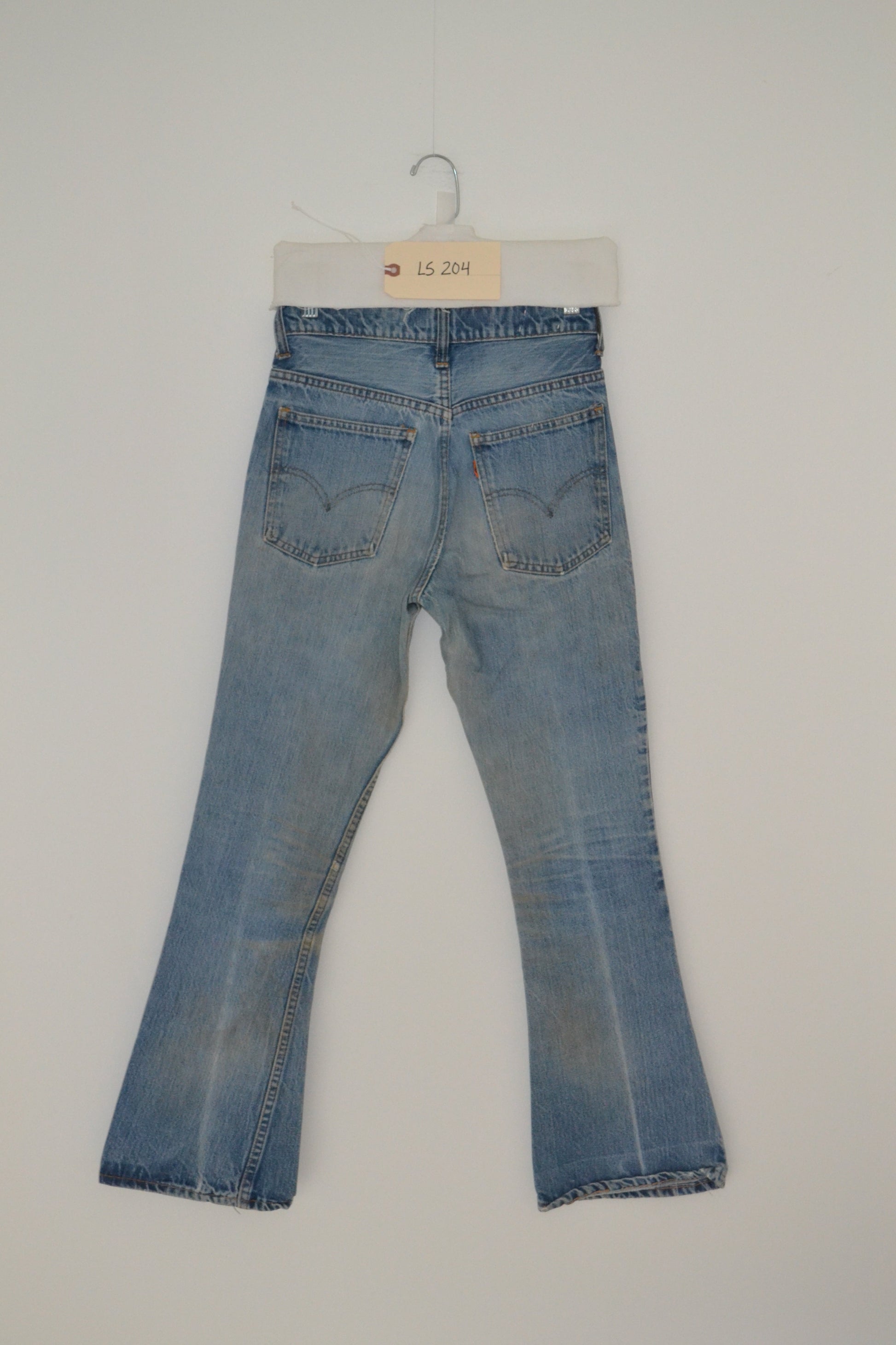 1970's Levi's Orange Tab Flare Jean. This beautiful light shade shows great wear marks, fading and intense creases on center front and back leg.