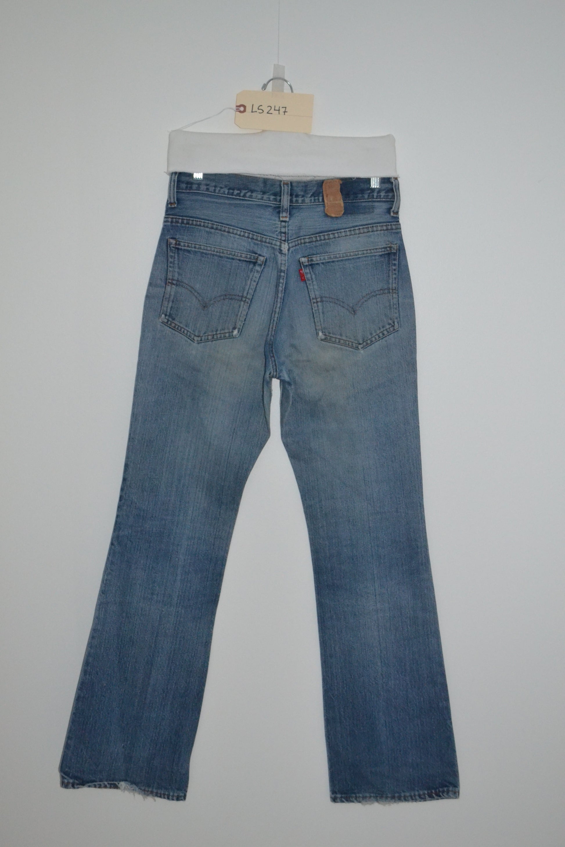 1970's Vintage Levi's Boot Cut Jean. This medium-light shade has great wear including leg fade, contrast whiskers, knee burst, and hem distressing.