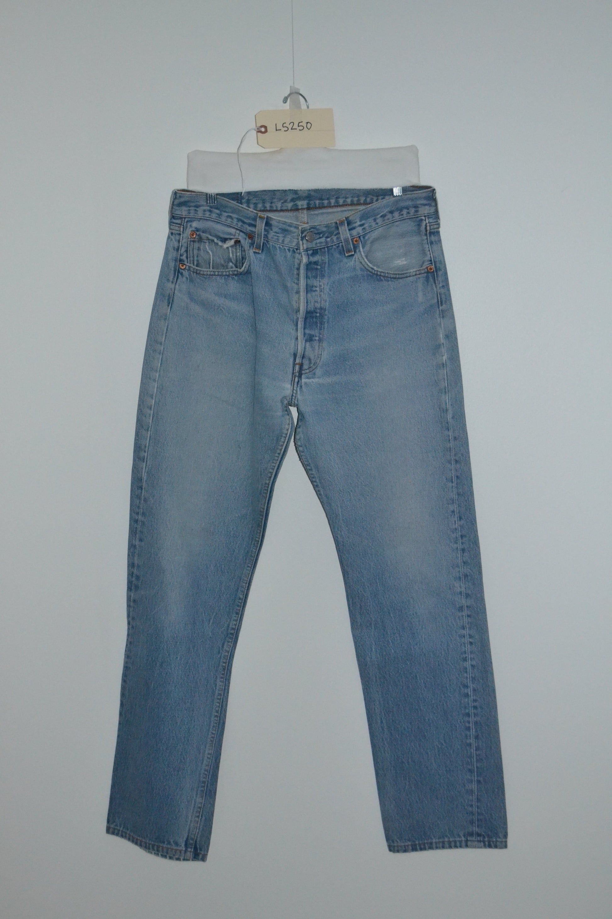 1970's Little E Levi's 501 Jean. This light wash has a great even fade and wear pattern including whiskers, highs and lows of color and back pocket wallet impression.