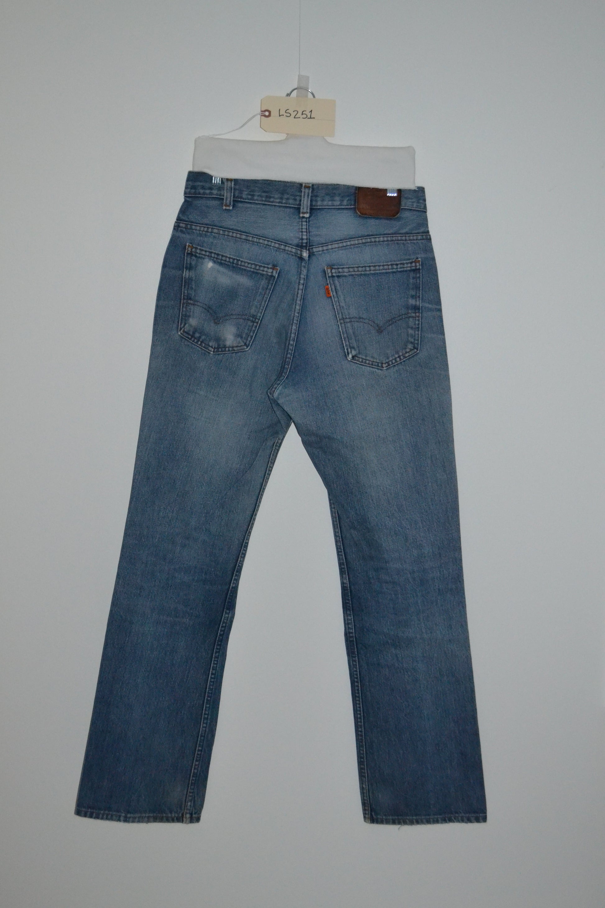 1970's Levi's Orange Tab Jean. This Medium blue shade has great wear and some destruction. The contrast whiskers, knee burst, thigh holes, back pocket, wallet impression, whiskers, destructed holes,high contrast, back pocket ,wallet impression,