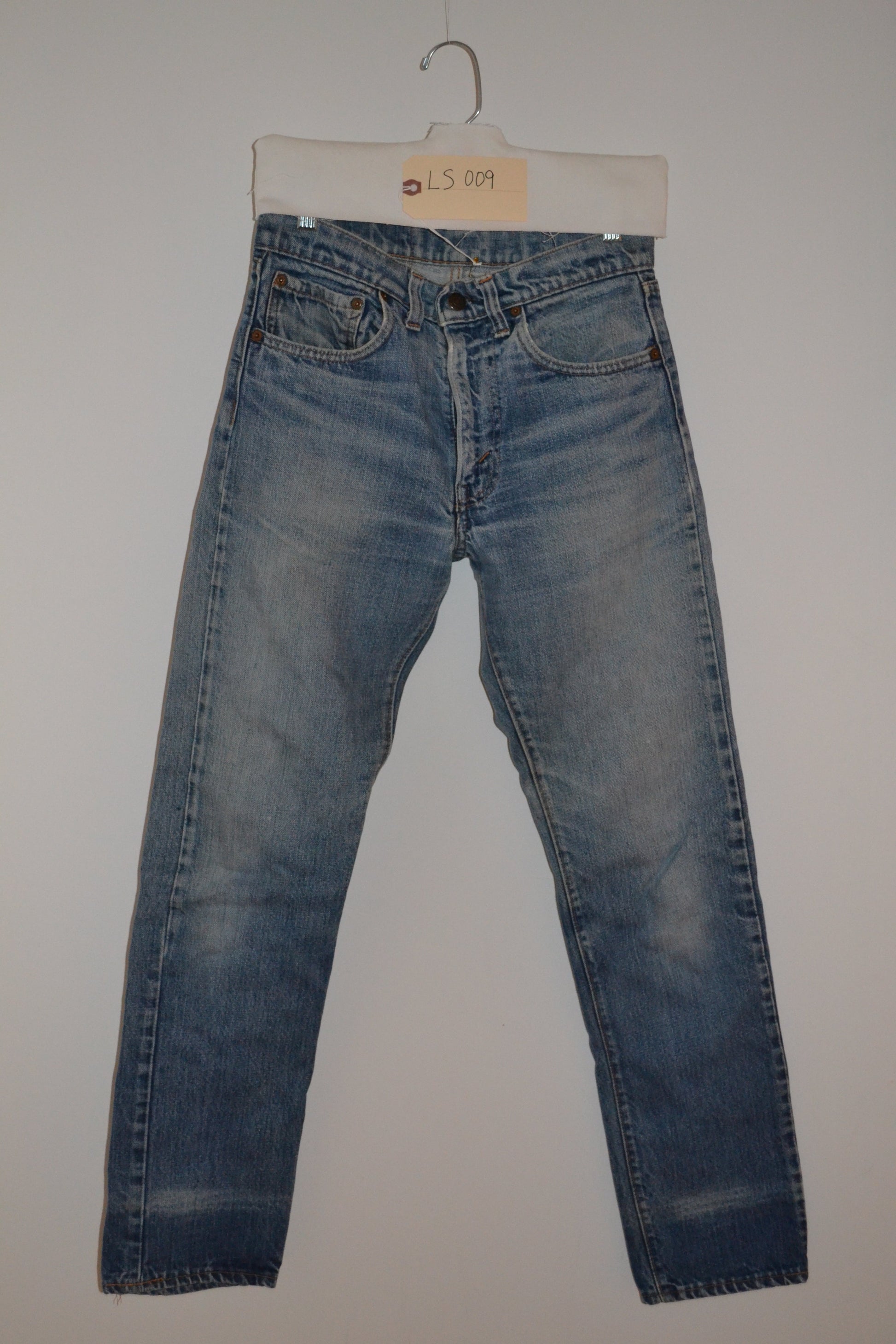 1970's Vintage Levi's 505 Jean.Faded and bleached to a covetable Light Blue color. The interesting creased fade patterns on hems indicate the history of the jean when the hems were folded under and after time exposed permanent faded wear marks and then a darker shade at the bottom hem . Whisker pattern and allover wear marks of a true favorite jean which was obviously well worn and loved