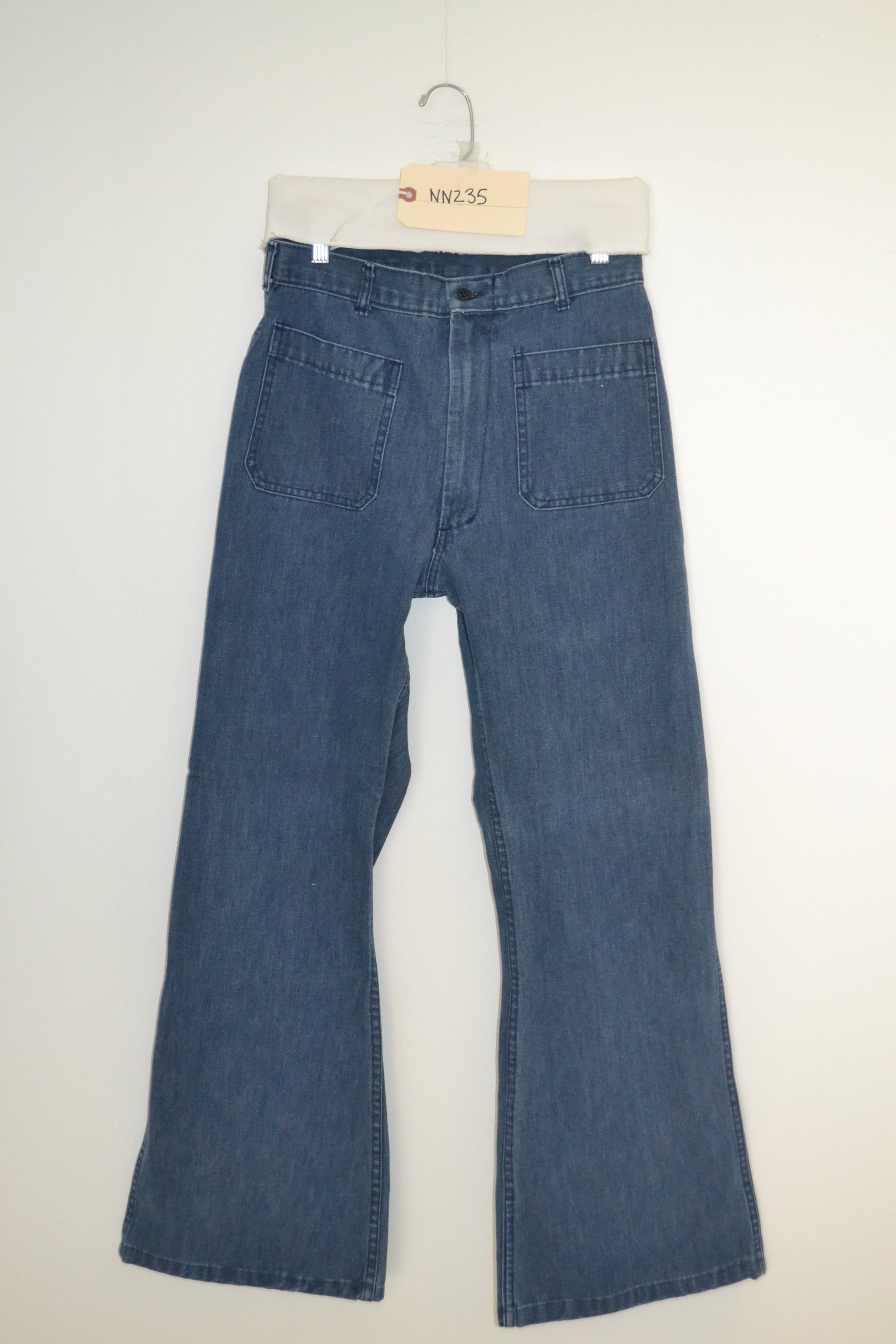 1970's Fashion Sailor Jean. This flare jean is a mid blue denim with double felled seams, front and back patch pockets and zip fly.