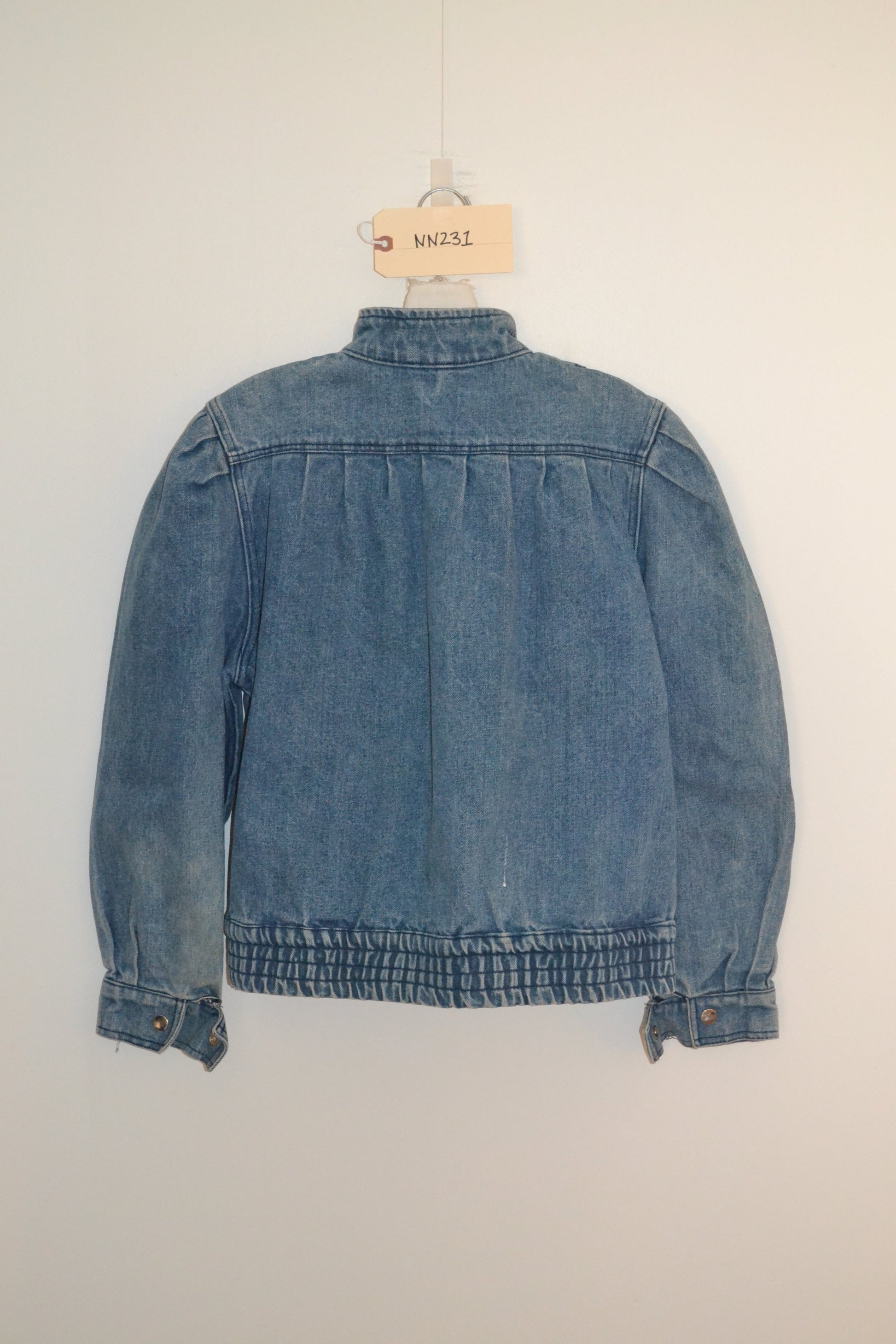 1980's Fashion Denim Jacket. This super Eighties Mid bright blue jacket has marble wash effect, puff sleeves, pleated yoke, welt pockets and elasticated waistband.