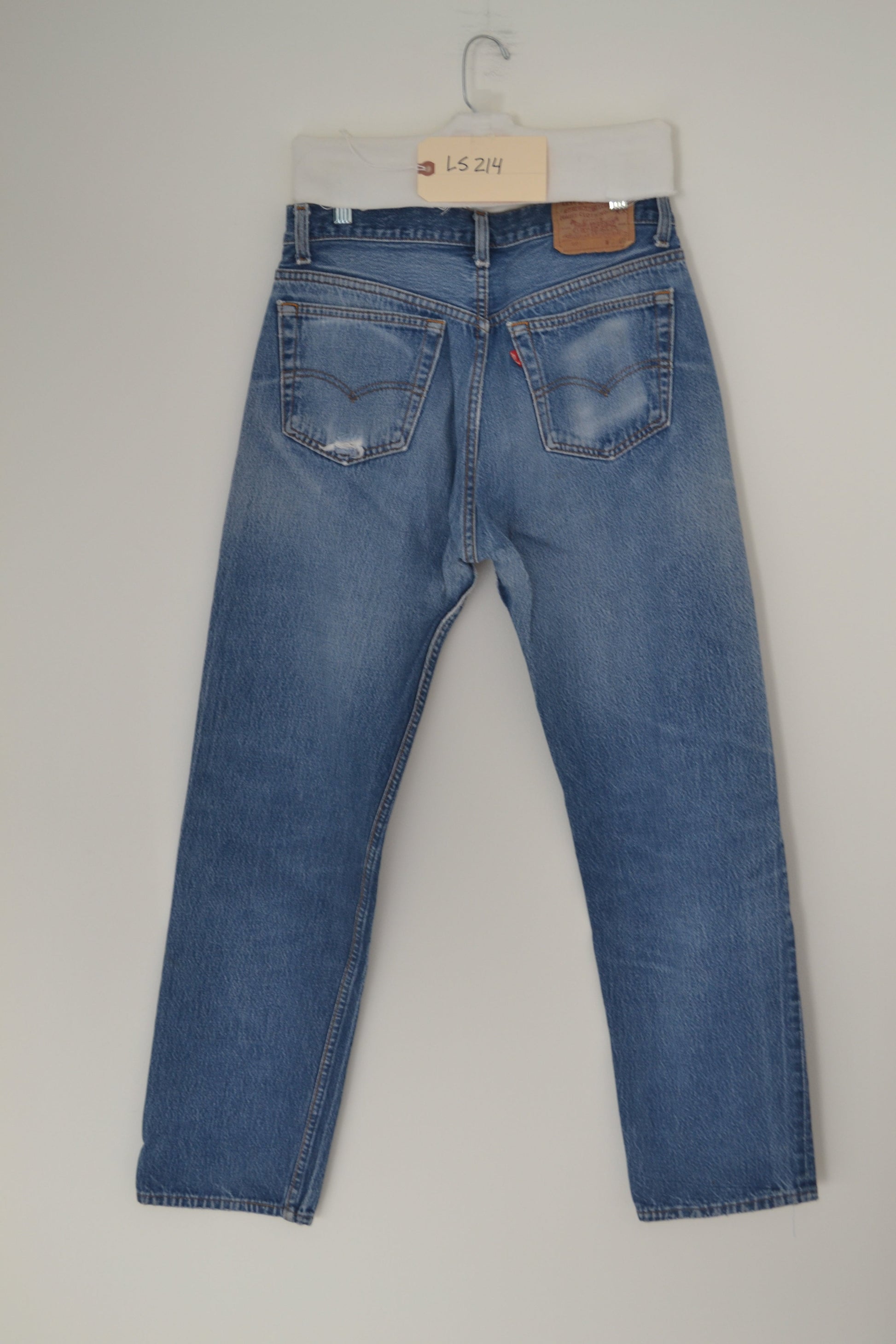 1980's Levi's Little E 501 jean. This light faded blue wash has good wear marks. The back has a distinct wallet impression, great fade , and some destruction on the pocket corners.