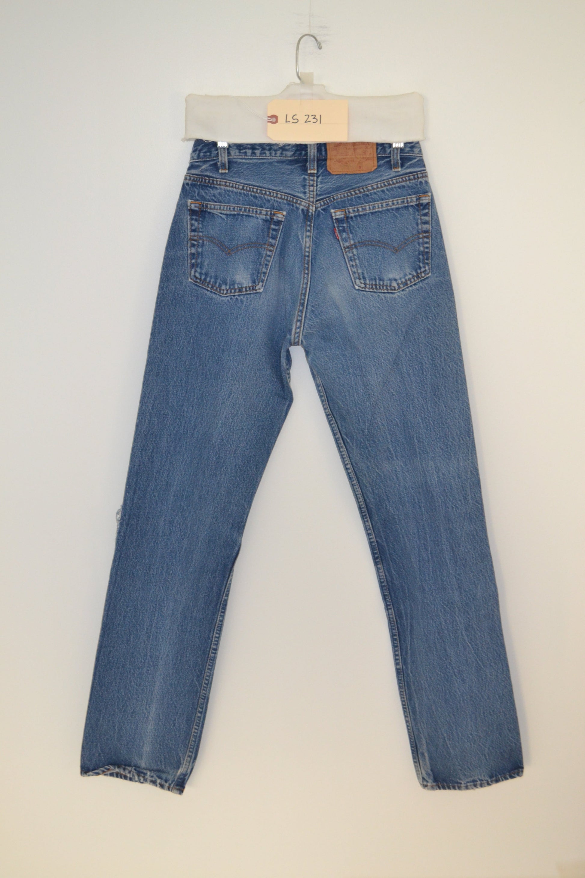 1980's Little E Levi's 501 Jean. The medium blue shade has minimal wear but great depth from the marbling and veining in the wash.