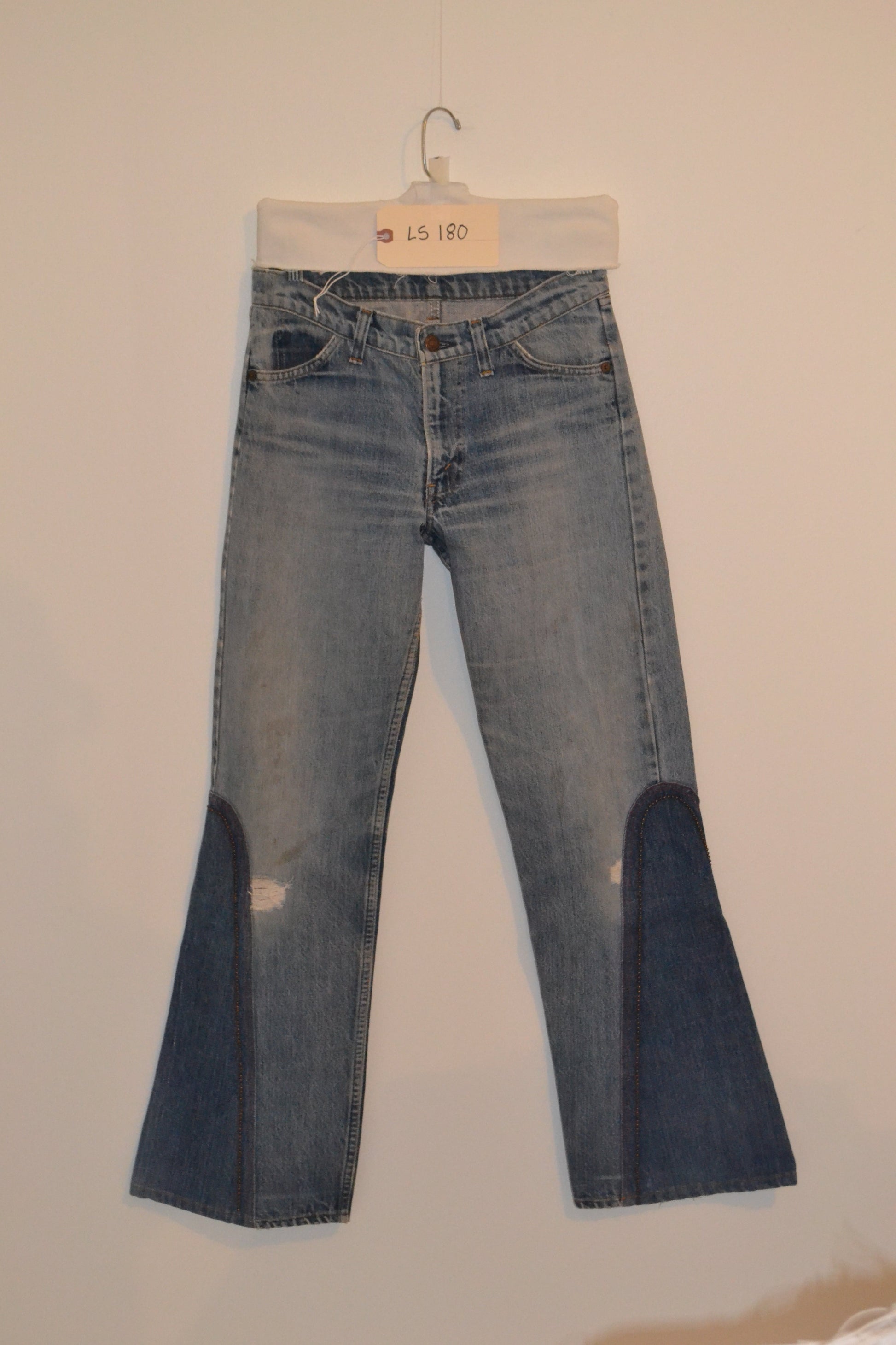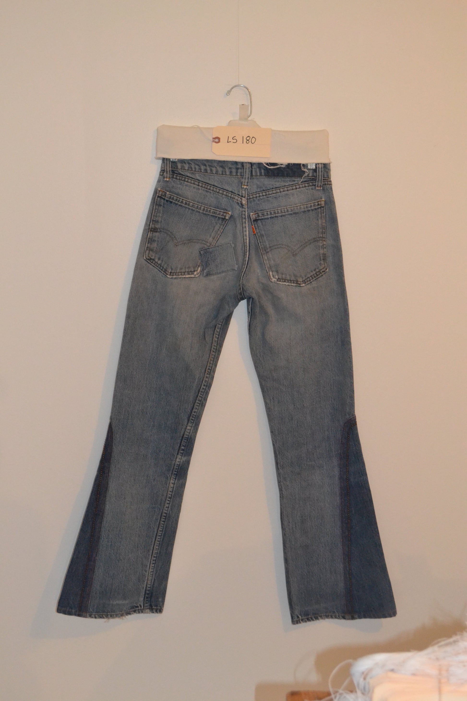 1980's Levi's Orange Tab Flare Jean. The medium light shade of indigo has great whiskers ,wear , and minor destruction, plus a personalized DIY customization with the added denim panels on legs, metal studding and hand sewn and repaired patches.