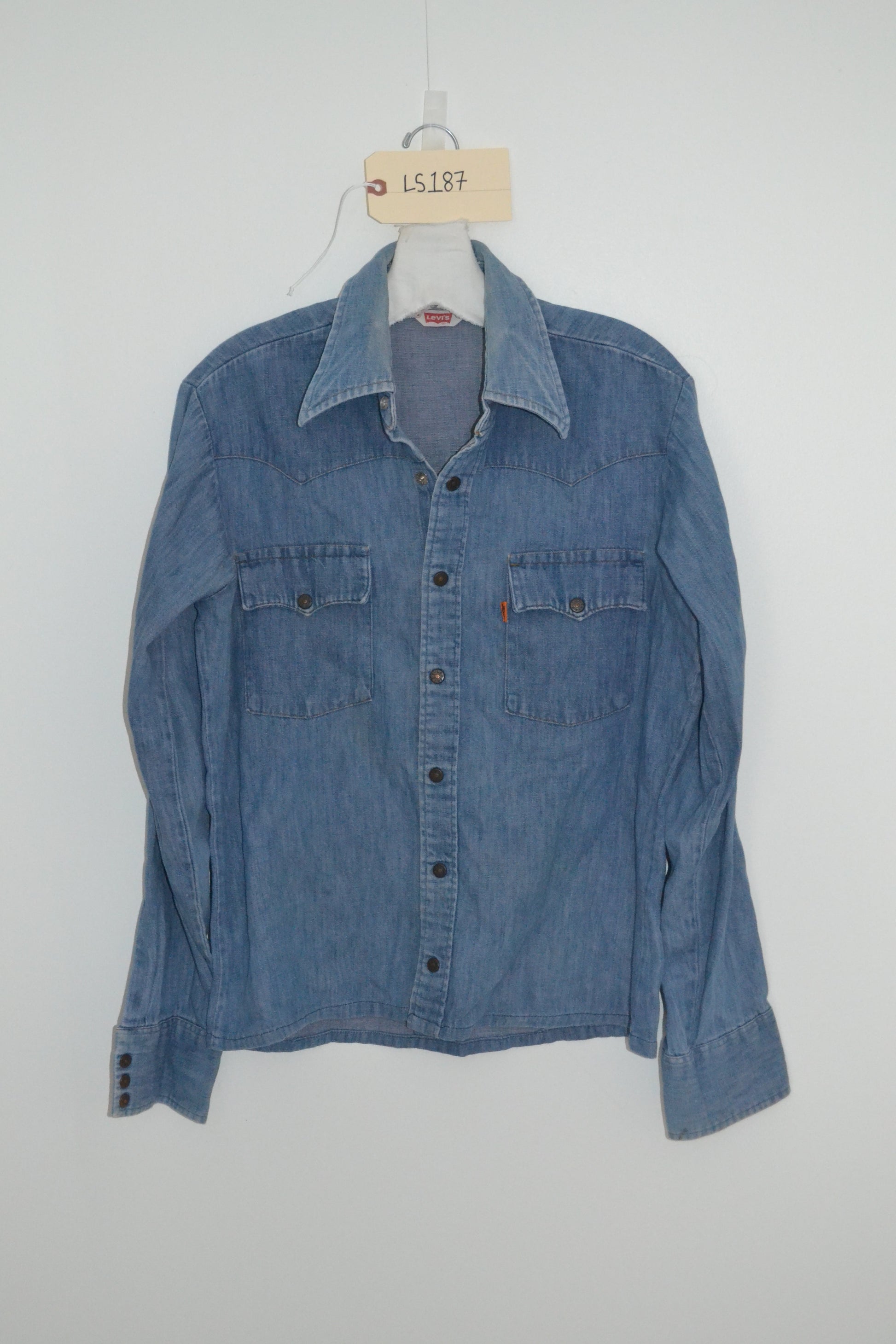 1980's Levi's Orange Tab denim shirt. This medium blue light weight denim has great vintage details and shape. It has " western shirt " styling including snap front closure, pointed pocket flaps with button closure, pointed yoke panels, wide 3 snap cuffs and a straight hem. The wash is a nice evenly faded indigo with subtle wear and light distressing on seams.