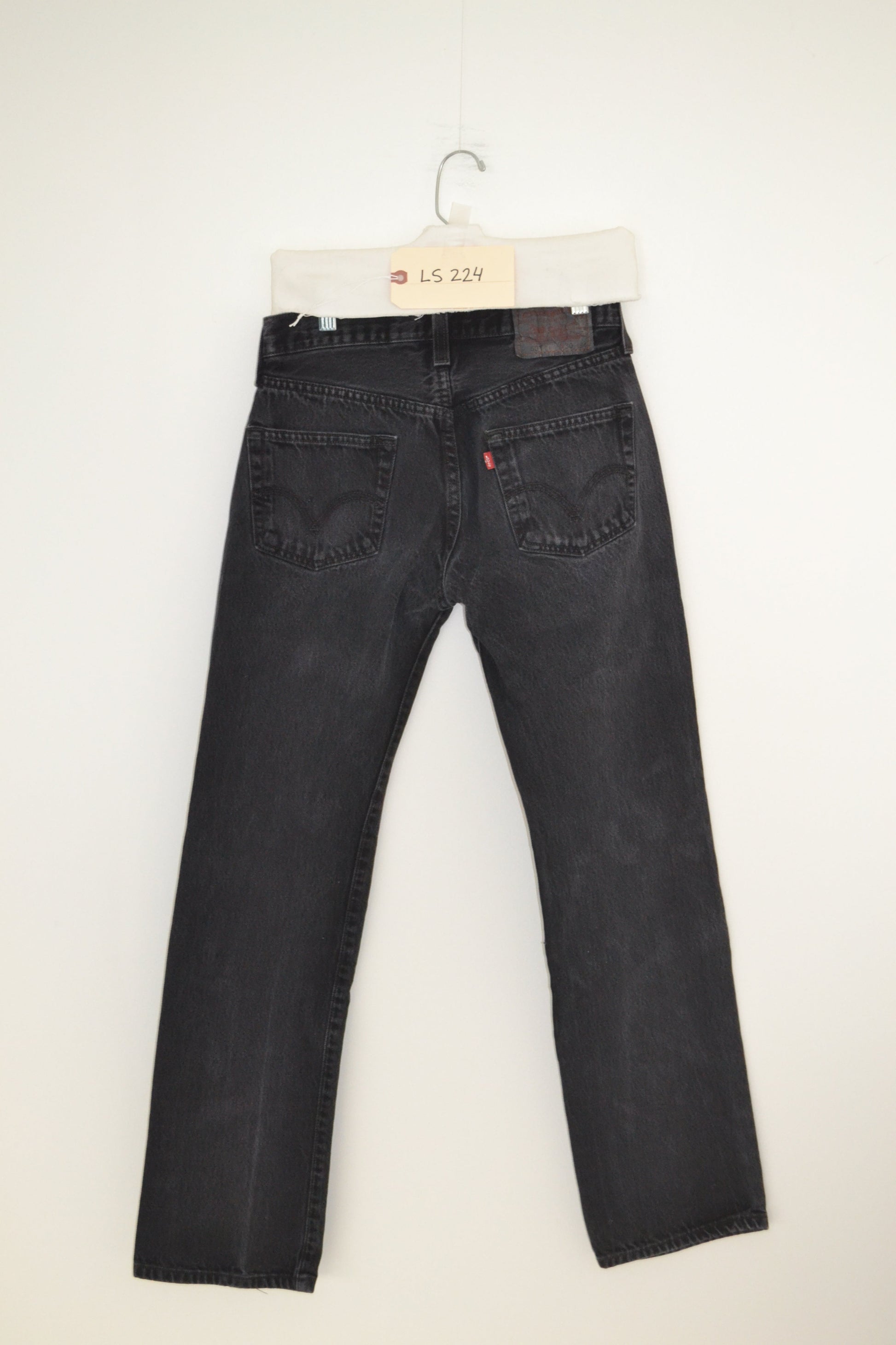 1990's Little E Levi's 501 Black/ Black jean. This black denim has a marble wash effect, subtle highs and lows and limited wear.