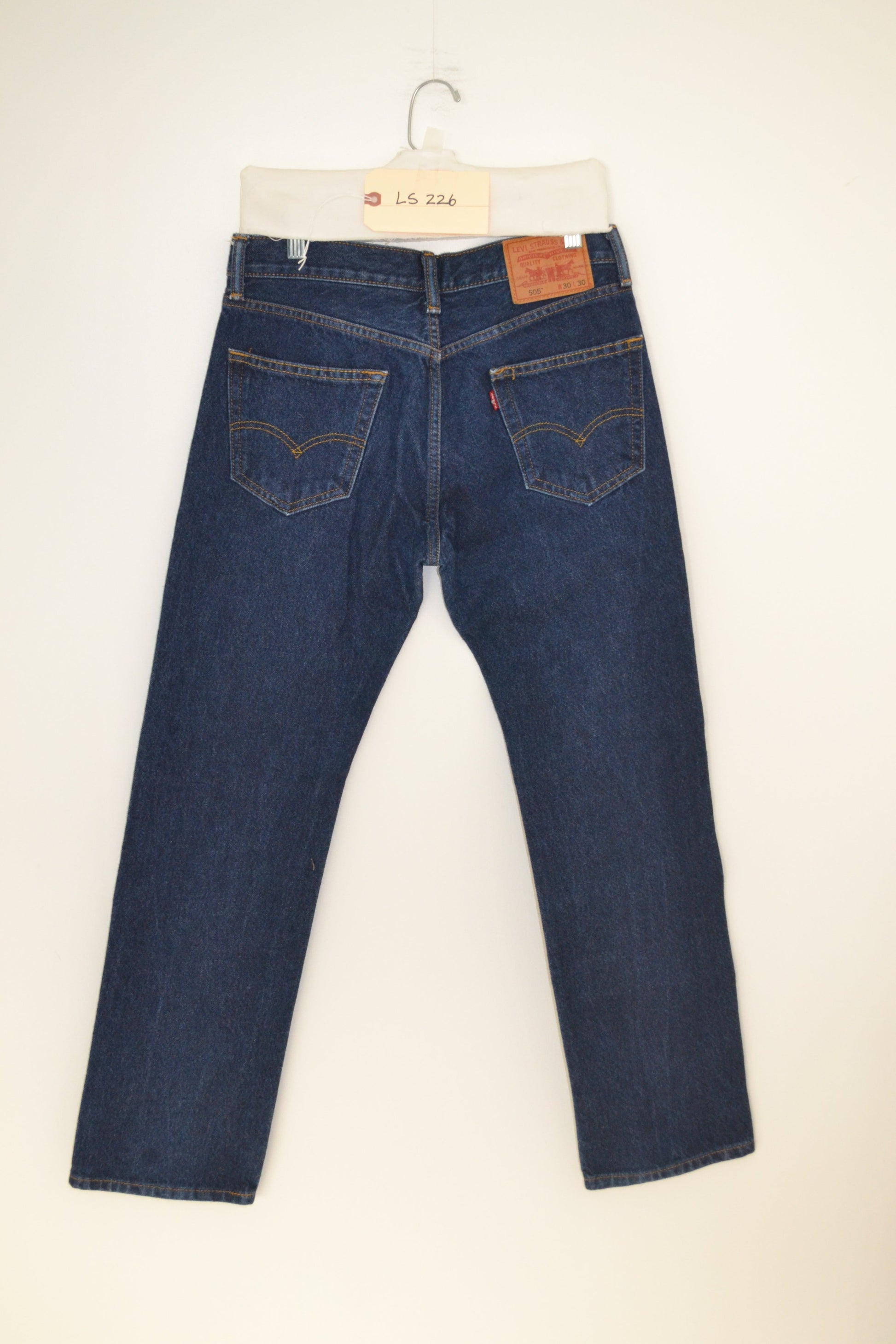 1990's Little E Levi's 505 jean. This is dark indigo rinse wash has an overall even fade with subtle marble and slight veining and no visible whiskers or wear marks.