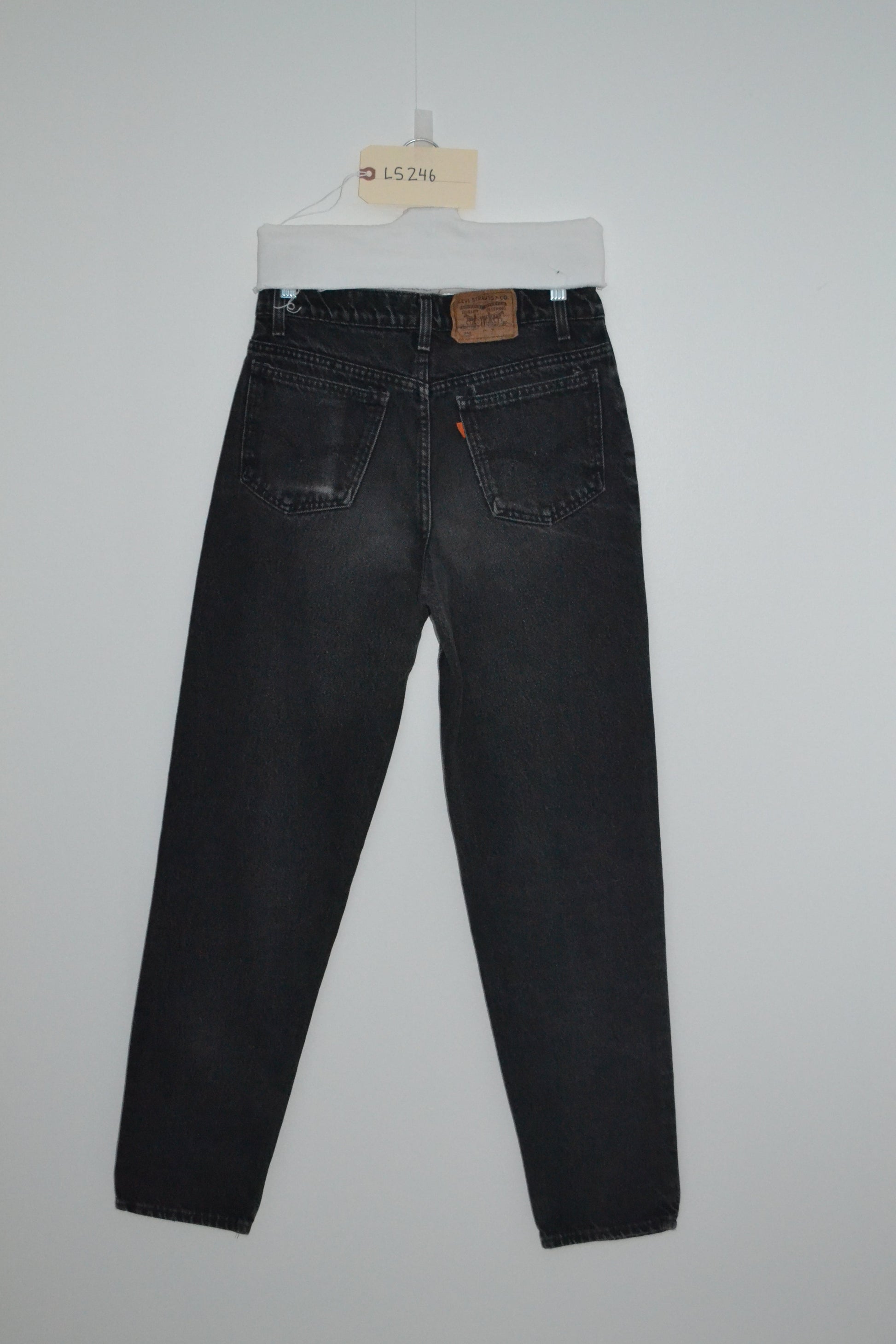 1990's Orange Tab Black/black Jean. This black jean has good subtle wear, whiskers, good fade and a marble effect to the wash.