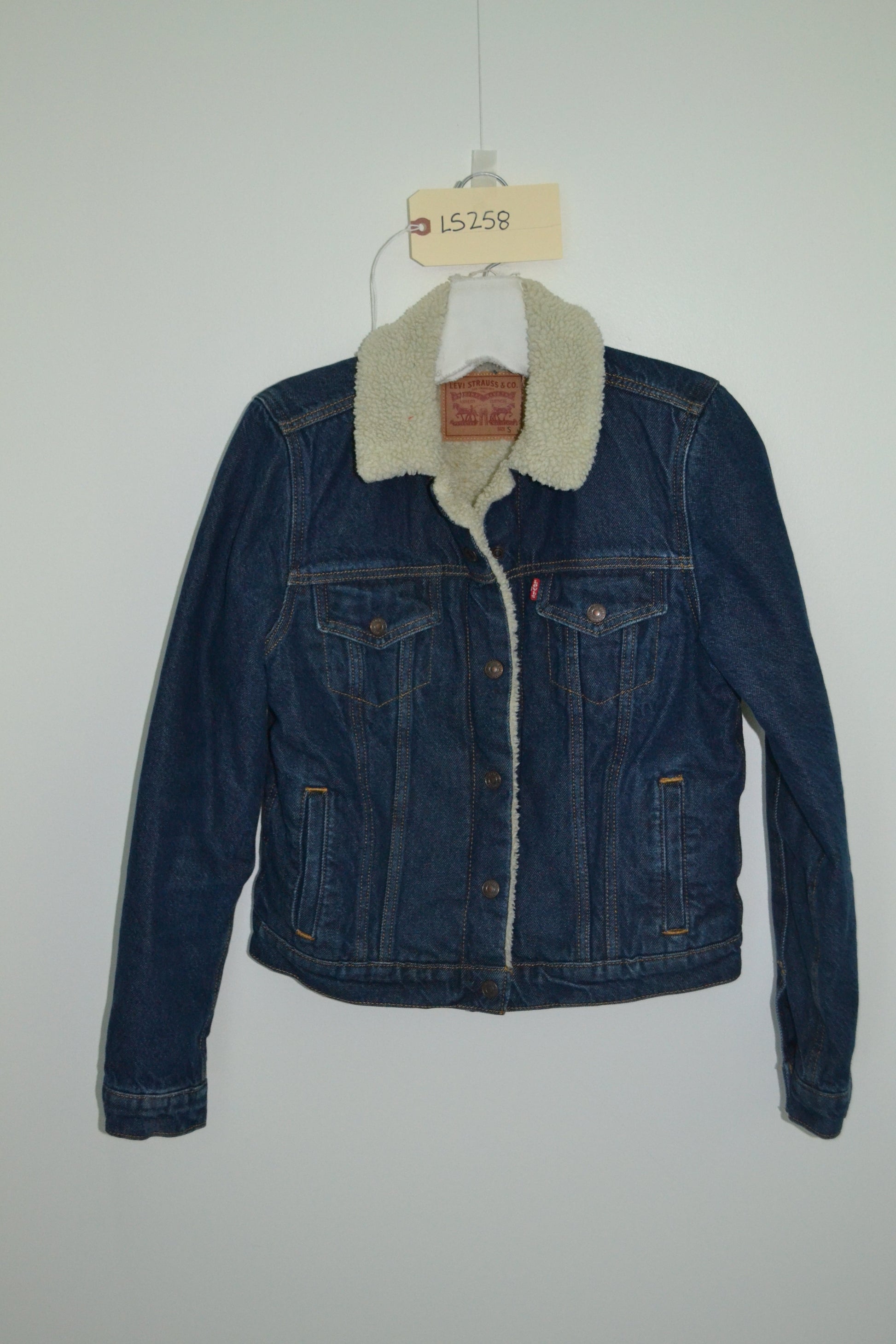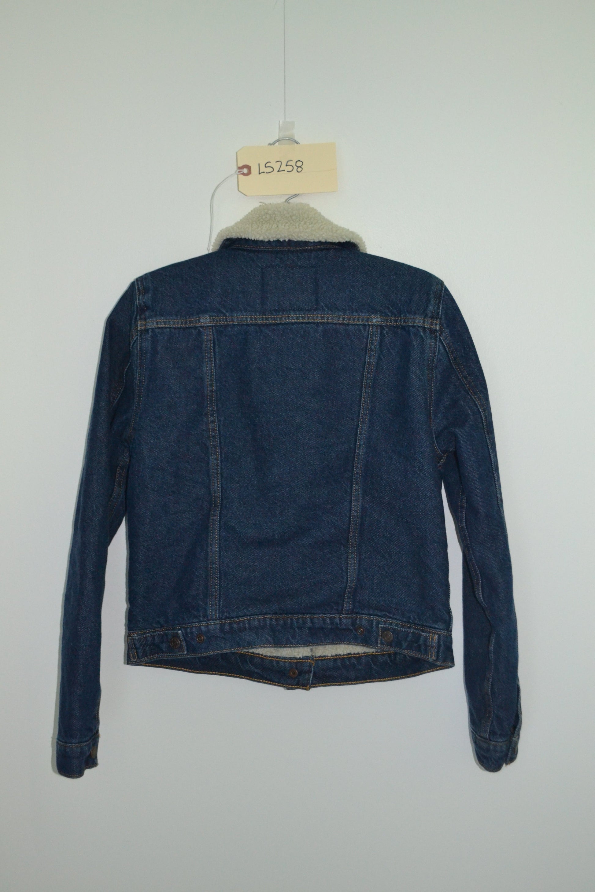 2000 Little e Levi's Red Tab Trucker Jacket. This adorable sherpa lined kids Trucker is an open fill right hand denim in a rinse wash with some high point abrasion