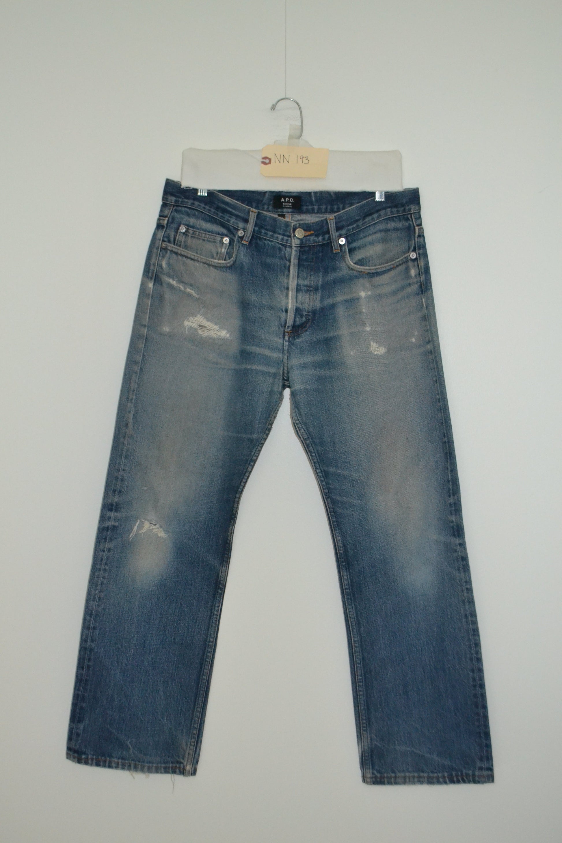 2010's APC RESCUE Jean. This medium blue indigo has amazing fade, wear, hem distressing, holes, and repair on front pocket, back pocket crotch and knee,