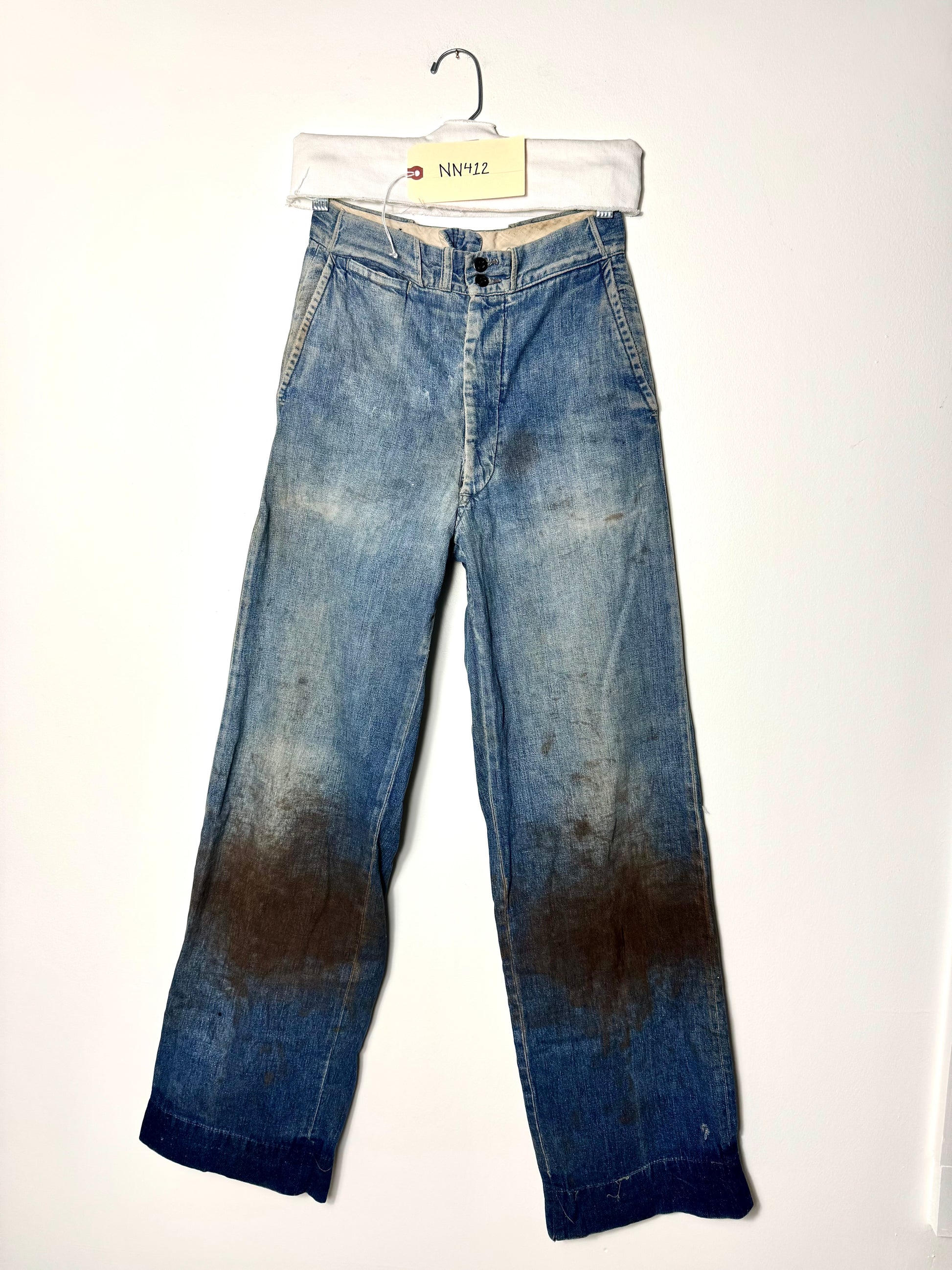 Amazing lightweight denim, Tough Nut Workwear trousers. Significant wear on these trousers and a curious band of red clay dirt on the knees. I love the beltloop details and double button waistband.